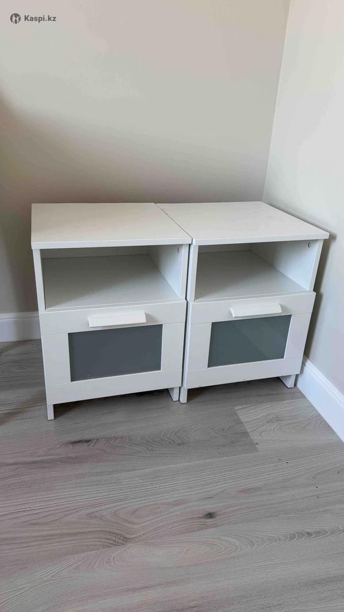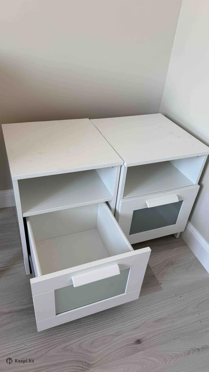 Прикроватные тумбы 2 шт, икеа бримнэс, б/у, есть дефект в виде пятна. 2 шт за 12.000 тенге. Хорошая цена такие новые стоят по 40.000 каждая.