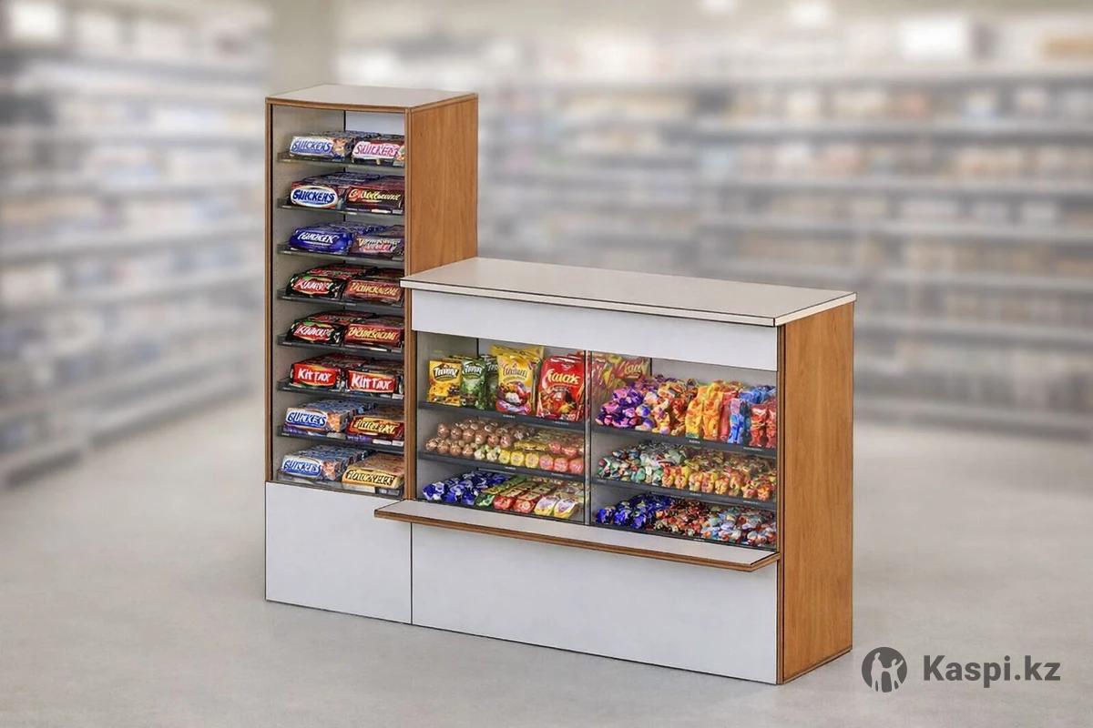 Изготовление витрины для магазина Стильный и функциональный прилавок с остеклёнными витринами — идеально подойдёт для продажи конфет, шоколада, снеков, косметики или мелкого товара. Конструкция: •Высокая вертикальная витрина с несколькими стеклянными полками •Горизонтальный прилавок с двумя стеклянными секциями •Нижние закрытые модули для хранения •Удобная рабочая столешница Материалы: •Корпус — ЛДСП (древесный декор + белые фасады) •Полки — стекло •Презентабельный внешний вид Преимущества: •Отличная обзорность товара •Компактная, но вместительная конструкция •Подходит для торговых точек, бутиков, минимаркетов •Можно использовать как кассовую зону