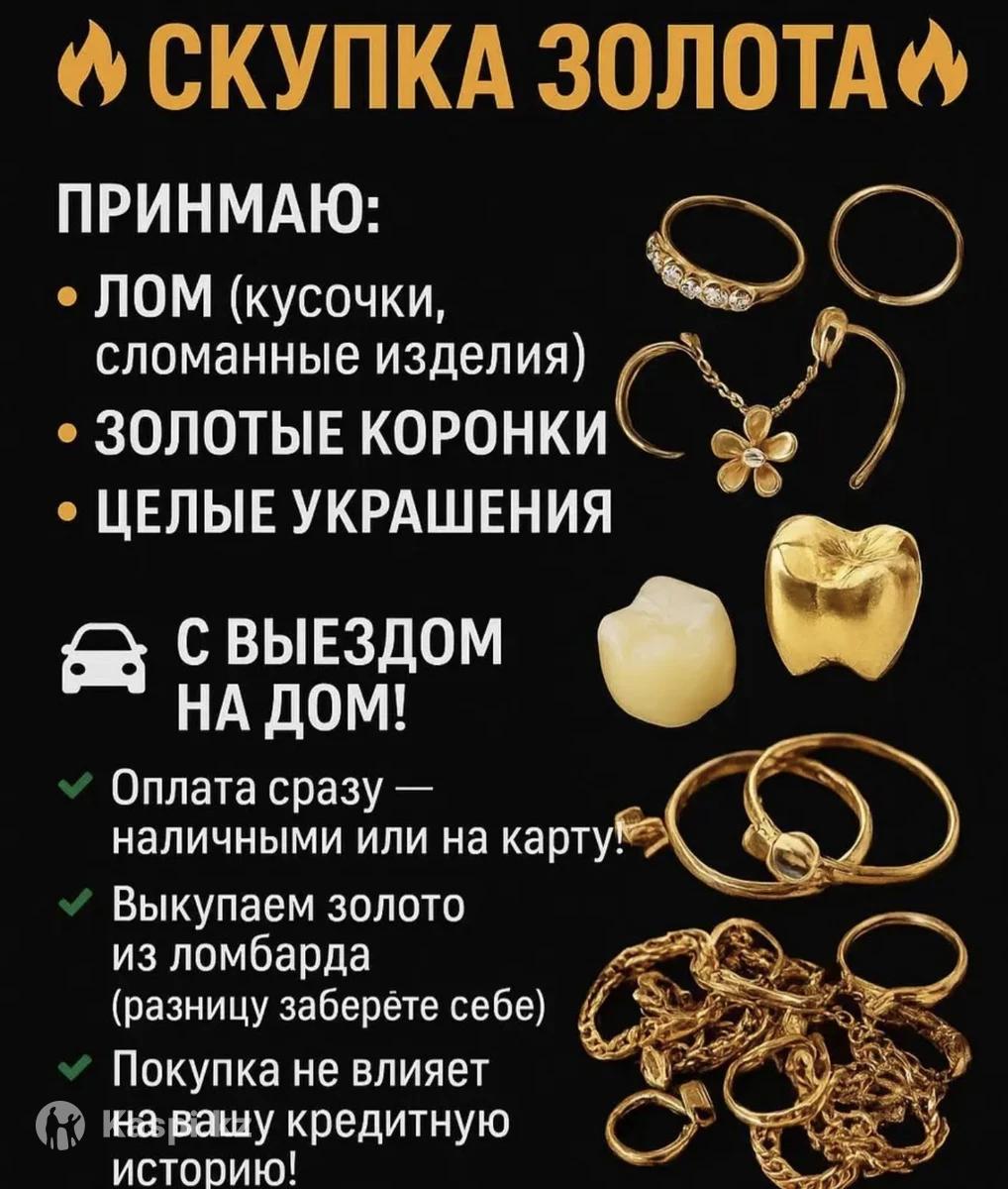 Принимаю: • лОм ( кусочки, сломанные изделия ) • ЗОЛОТЫЕ КОРОНКИ • ЦЕЛЫЕ УКРАШЕНИЯ С ВЫЕЗДОМ НА ДОМ ! • Оплата сразу — наличными или на карту ! • Выкупаем золото из ломбарда (разницу заберете себе) • Покупка не влияет на вашу кредитную историю ! БЫСТРО, ЧЕСТНО, ВЫГОДНО!