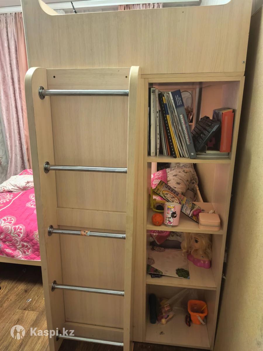 Двухъярусная кровать со встроенными шкафами и полками. Размер верхней кровать 2 метра на 90 см. Размер нижней кровати полноценная 1.5.