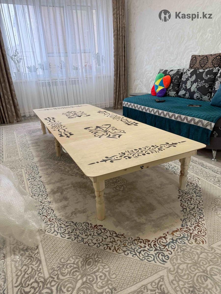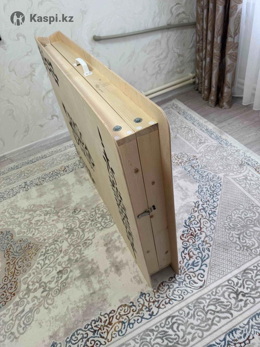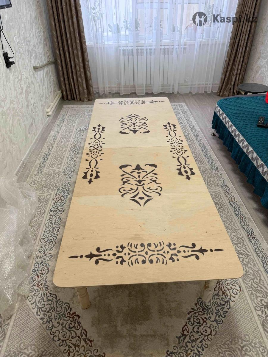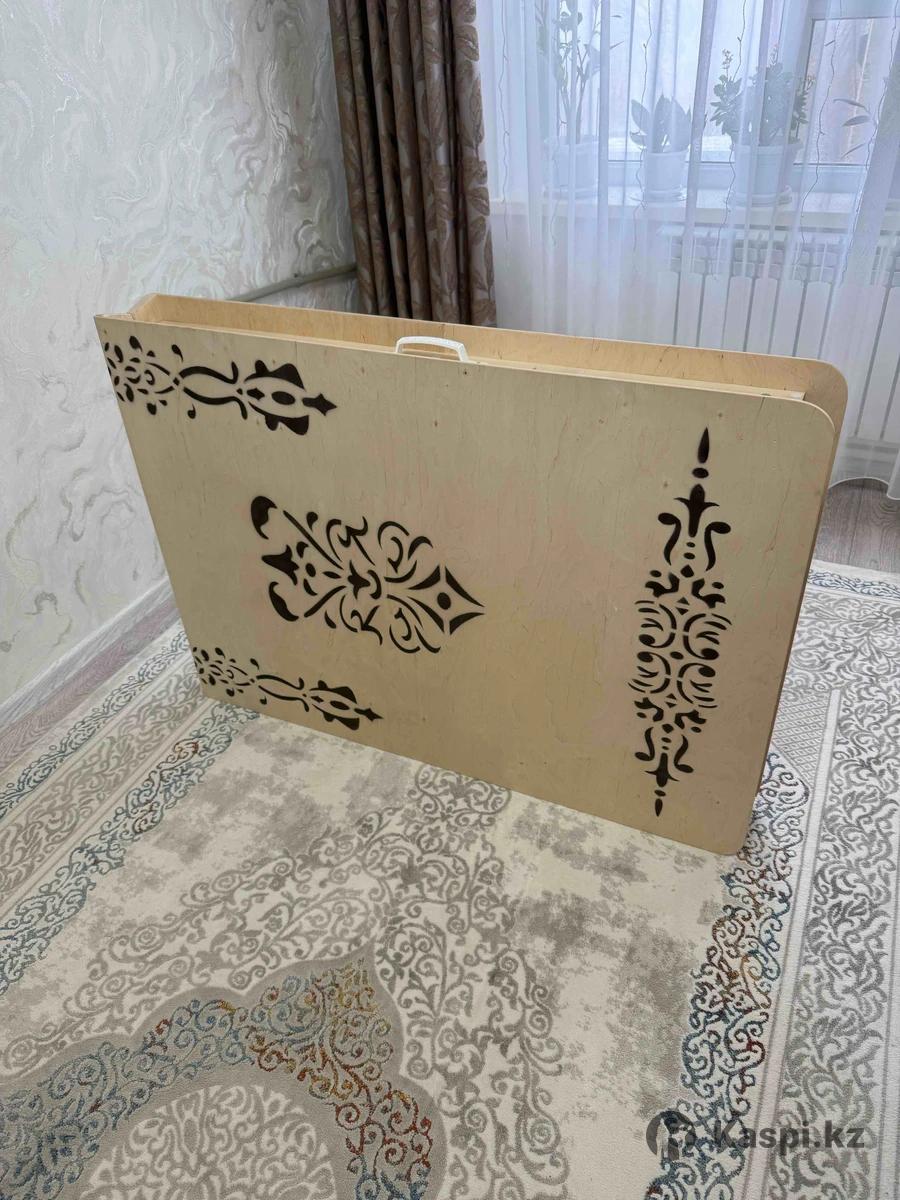Продается новый жер стол «Баракат» в цвете слоновая кость. Ни разу не использовался. Размер: 250×90×38 см Материал: фанера Стол складывается в книжку удобно перевозить и хранить Красивый национальный орнамент, аккуратная обработка, устойчивые ножки.