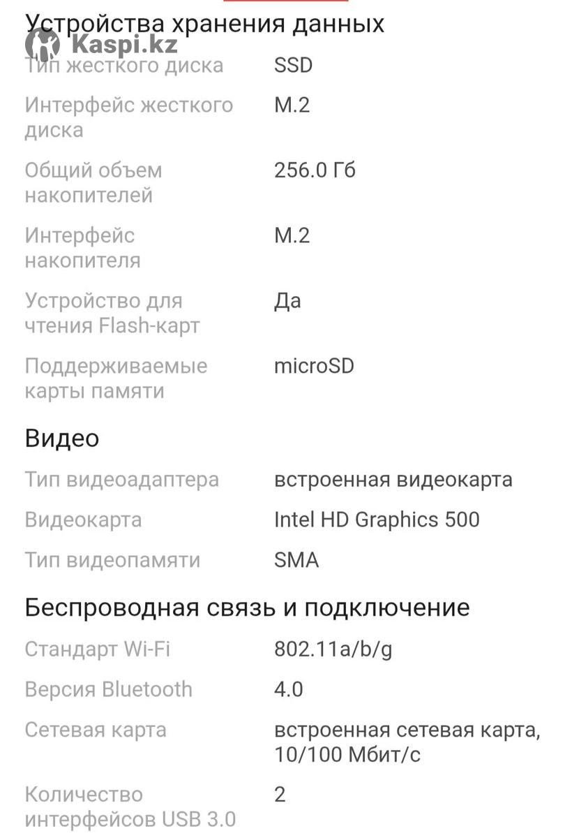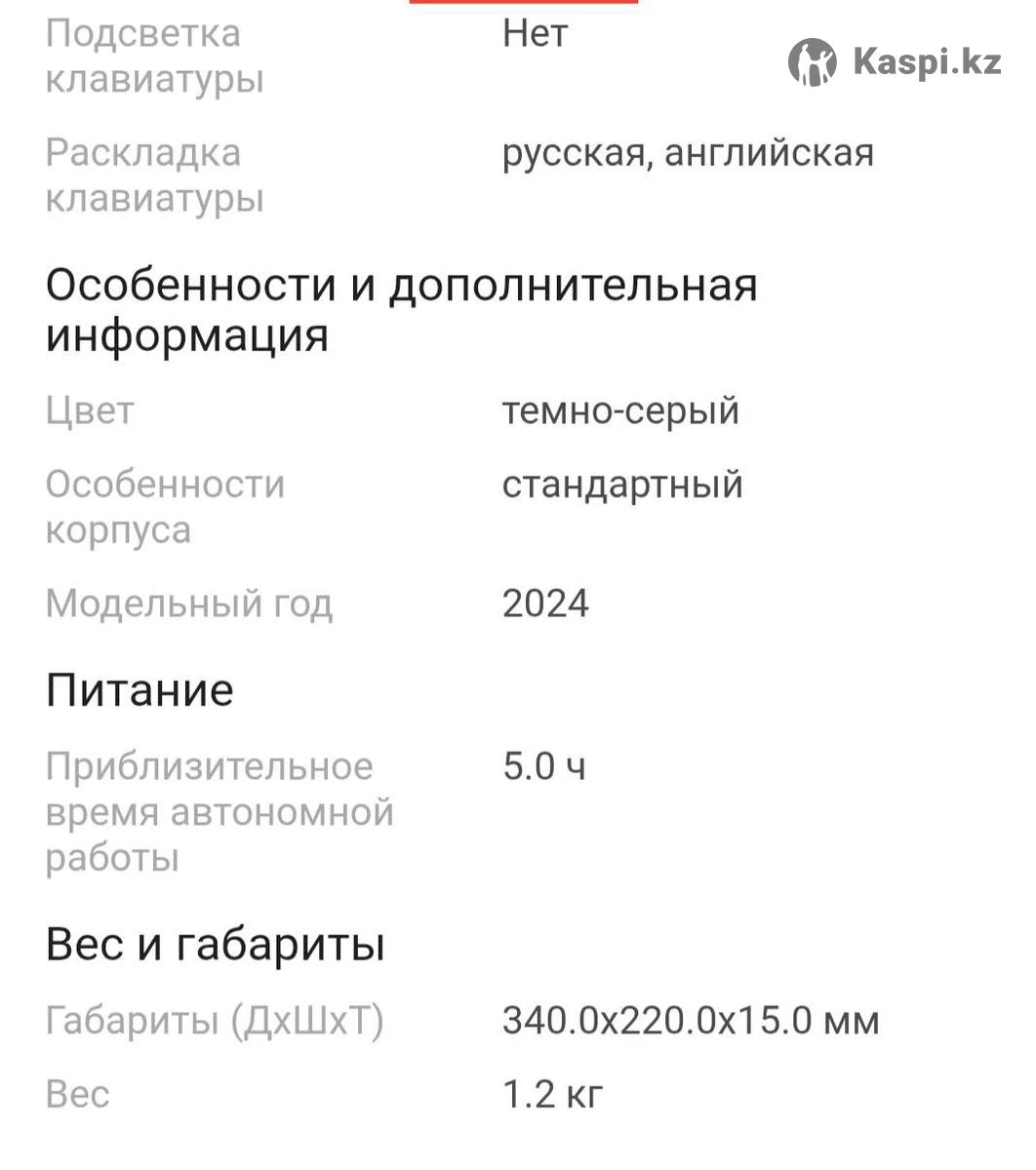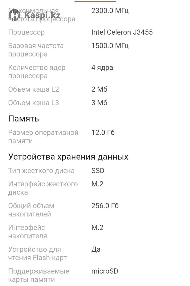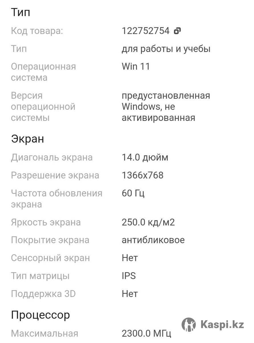 Продаётся ноутбук в упаковке! Ноутбук HYDRA H14 14 дюймов / 12 ГБ / SSD 256 ГБ / На сегодняшний день в каспи магазине стоит 300 000 тенге. Тип: для работы и учебы Операционная система: Win 11 Версия операционной системы Экран предустановленная Windows, не активированная Диагональ экрана: 14.0 дюйм Разрешение экрана: 1366x768 Частота обновления экрана: 60 Гц Яркость экрана: 250.0 кд/м2 Покрытие экрана: антибликовое Сенсорный экран: Нет Тип матрицы: IPS Поддержка 3D: Нет Процессор Максимальная частота процессора: 2300.0 МГц Процессор: Intel Celeron J3455 Базовая частота процессора: 1500.0 МГц Количество ядер процессора: 4 ядра Объем кэша L2: 2 Мб Объем кэша L3: 3 М6 Память Размер оперативной памяти: 12.0 Гб Устройства хранения данных Тип жесткого диска: SSD Интерфейс жесткого диска: М.2 Общий объем накопителей: 256.0 Гб Интерфейс накопителя: М.2 Устройство для чтения Flash-карт: Да Поддерживаемые карты памяти: микроSD Устройства хранения данных Тип жесткого диска: SSD Интерфейс жесткого диска: М.2 Общий объем накопителей: 256.0 Гб Интерфейс накопителя: М.2 Устройство для чтения Flash-карт: Да Поддерживаемые карты памяти: микроSD Видео Тип видеоадаптера: встроенная видеокарта Видеокарта: Intel HD Graphics 500 Тип видеопамяти:СМА Беспроводная связь и подключение Стандартный Wi-Fi: 802.11a/b/g Bluetooth 4.0 Сетевая карта встроенная сетевая карта, 10/100 Мбит/с Количество интерфейсов USB 3.0 Bluetooth: 4.0 Сетевая карта: встроенная сетевая карта, 10/100 Мбит/с Количество интерфейсов USB 3.0: 2 Входы: наушники Выходы: мини-HDMI, USB Звук и устройства ввода Звук: микрофон, Встроенные динамики - 8 От /1W Подсветка клавиатуры: Нет Раскладка клавиатуры : русская, английская Особенности и дополнительная информация Цвет:темно-серый Особенности корпуса: стандартный Модельный год: 2024 год Питание: Приблизительное время автономной работы 5.0 ч Вес и габариты Габариты (ДхШхТ) 340,0 х 220,0 х 15,0 мм Вес: 1.2 кг Торг уместен. Покупателю беспроводная мышка в подарок.