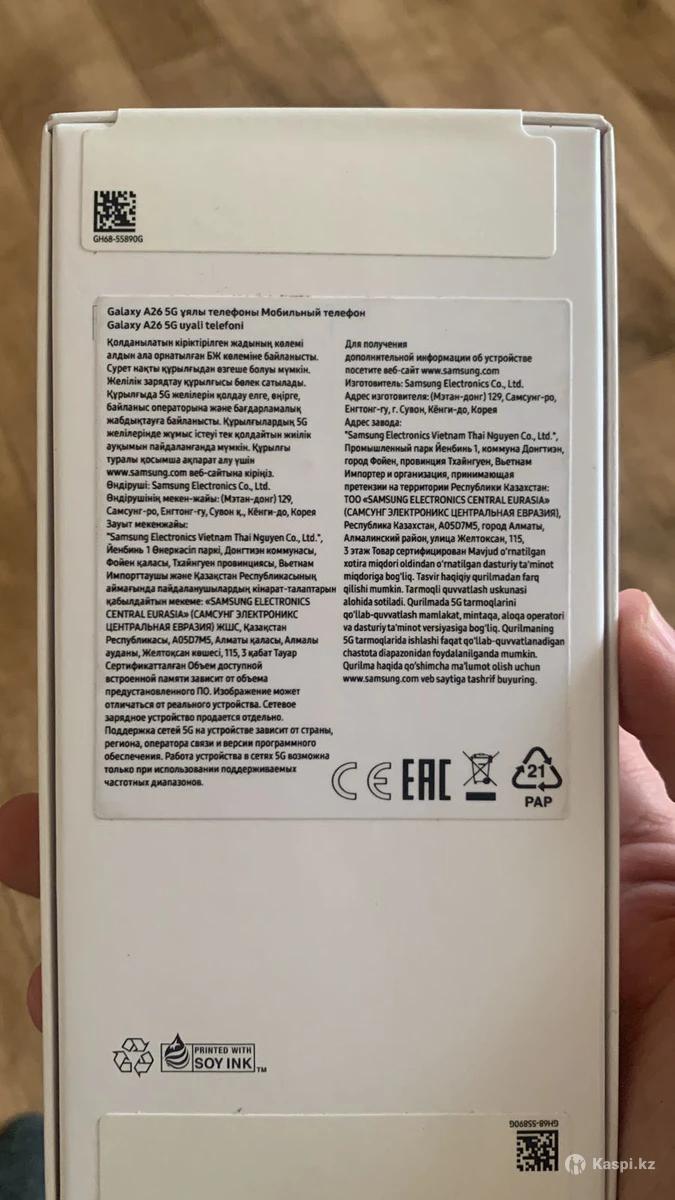 Samsung Galaxy A26 5G — это среднебюджетный смартфон с 6,7-дюймовым Super AMOLED экраном (120 Гц, FHD+), процессором Exynos 1380, тройной камерой 50+8+2 Мп с оптической стабилизацией и батареей 5000 мАч. Устройство поддерживает 5G, имеет защиту от воды IP67, 6/8 ГБ ОЗУ и 128/256 ГБ встроенной памяти, работая на Android 15/16. С чеком в коробке, не открывался Цена 100 000 без торга