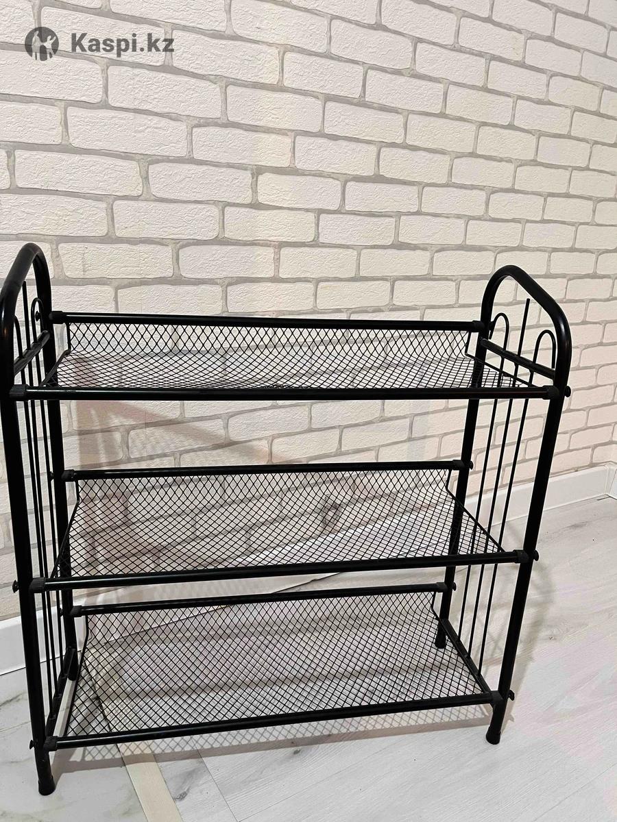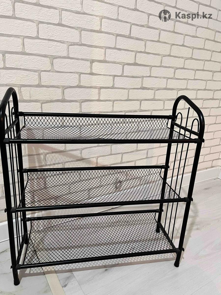 Продается обувница, три яруса для хранения обуви. В хорошем сосотоянии. Материал металл, цвет черный. Ширина 64 см Глубина 23 см Высота 67 см