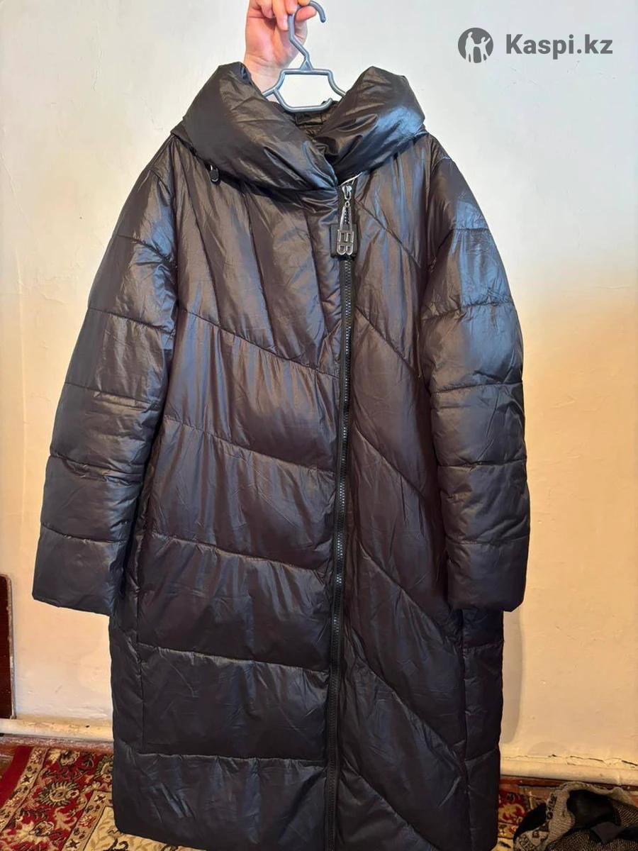 Продаю стильный теплый пуховик темного цвета (черный/графит).. Удлиненный фасон, диагональная стежка, высокий объемный воротник — защищает шею от ветра. Одевала всего один сезон. Покупала за 60000 тг. Размер 58-60