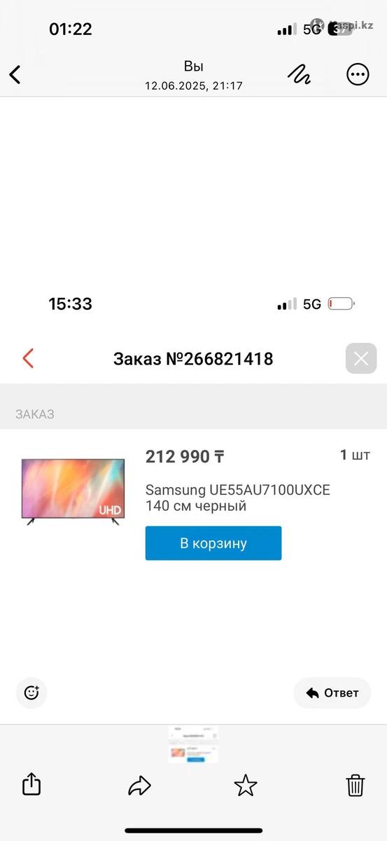 📺 Телевизор Samsung UE55AU7100UXCE (55”, 4K Smart TV) 💰 Цена: 100 000 тг (возможен торг) 🛠 Состояние: Экран не работает, требуется замена матрицы. Телевизор проработал 2 года без перебоев, был куплен в июне 2023 года. Все остальные части в порядке — плата, корпус, пульт, звук и питание. 🧾 Характеристики модели: •Диагональ: 55 дюймов / 140 см •Разрешение: 4K UHD (3840×2160) •Smart TV на Tizen OS •Поддержка HDR10+ •Подключения: Wi-Fi, Bluetooth, HDMI, USB •Тонкий безрамочный дизайн •Звук: 20 Вт, Dolby Digital Plus 📦 В комплекте: Пульт 📩 Пишите в чат, отвечу на все вопросы. Возможен торг для реального покупателя.