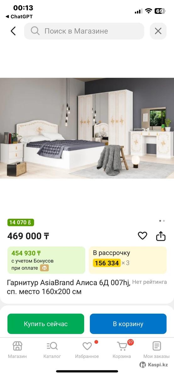 Покупали 2 года назад , новая все в хорошем состоянии, продаем так как делаем ремонт , кровать без матраса В каспи около 500. Тысяч кажется . Можем продать отдельно кровать шкаф и тумбы и туалетный столик