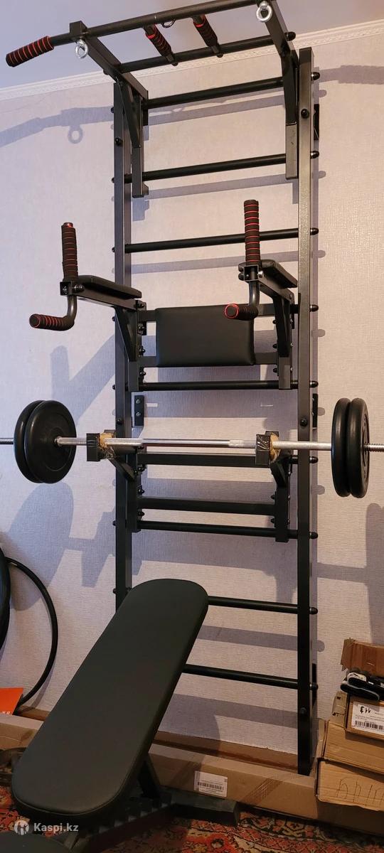 Профессиональная шведская стенка в упаковке изготовлена из толстостенного профиля , покрытого эмалью , обрезиненные перекладины . Навесной турник 3 хвата , неопреновые накладки , брусья , крепление под штангу , штанга 50 кг , скамья для жима , стенка крепится к стене , грузопод"емность до 200 кг .