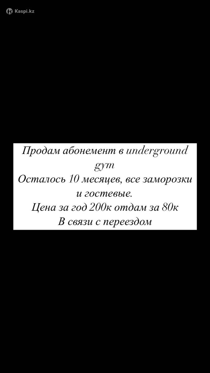 Стоит 200к , продам за 80. Сохранились все заморозки, почти на 3 месяца. Входит сауна , все залы по Астане, групповые занятия. 10 месяцев осталось. До 8 марта + заморозки