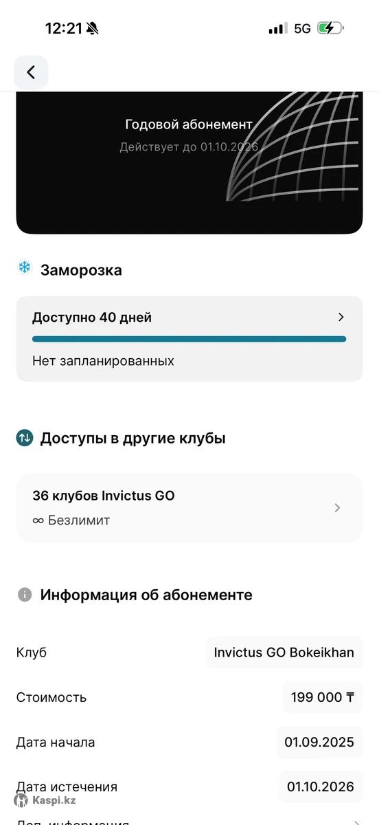 Продам действующий абонемент в тренажерный зал Invictus По с доступом в 36 залов по РК и в Бишкеке ✅ Осталось 9 месяцев ✅ доступны заморозка на 40 дней ✅ 7 гостевых посещений ✅ Полный доступ ко всем зонам и тренировкам клуба ✅ Современное оборудование, комфортные залы ✅Gym buddy (доступ к записанным тренировкам на год) Причина продажи — не получается посещать по личным обстоятельствам. Переоформление официальное через клуб. 💰 Цена: 140 000 тг (торг есть) 📩 можно на