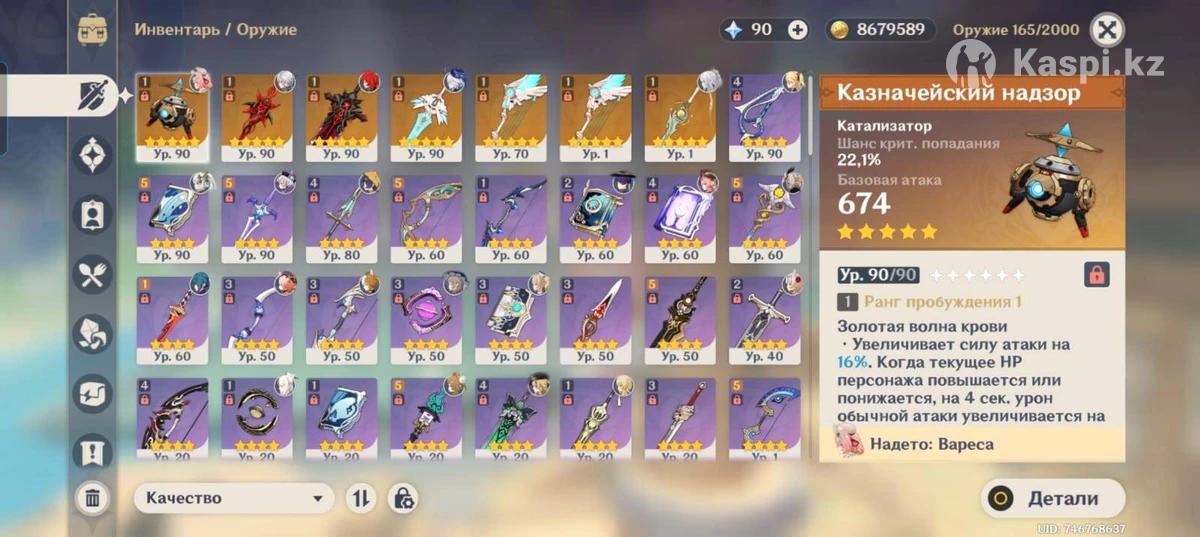 Легендарные: АрлекиноC1+сигна (90 лвл) Нахида (90 лвл) Ванесса (90 лвл) Цици C1(90 лвл) Лаума (60 лвл) Кли (90 лвл) Фурина (80 лвл) Дилюк C1(70 лвл) Странник (50 лвл) Цзы бай (20 лвл) Навия (20 лвл) Мидзуки (20 лвл) Кэ Цин (20 лвл) Тигнари (20 лвл) 4☆персонажи с С6: Сян Лян,Янь Фэй,Фарузан Легендарные оружия: Казначейский надзор,Очертания алой луны,Волчья погибель,Небесный меч,Небесное крыло×2,Светоносный осколок луны Сюжетка пройдена до Натлана,а так же есть множество не законченных заданий.Статуя архонтов прокачать до 10 лвл Инадзума,Мондштант,ЛиЮэ. Есть авентовские оружия 4☆