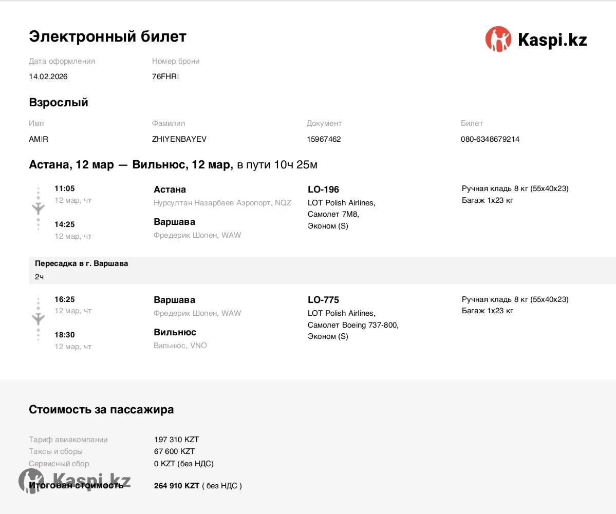 Продам авиабилет Астана-Вильнюс на 12.03.2026 год. Длительность полёта 10 часов. Покупал за 264910тенге, продаю за 220 000 в связи с форс-мажор обстоятельствами. Билет не возвратный.