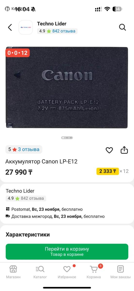 Продам батарейку для canon Абсолютно новая, купила не подошел Некоторые из моделей, которые поддерживают батарею LP-E12: Canon EOS M (беззеркалка) + 2 Canon EOS M2 Википедия Canon EOS M10 Википедия Canon EOS M50 Википедия Canon EOS M50 Mark II Википедия Canon EOS M100 Википедия Canon EOS M200 Википедия + Canon EOS 100D (это же как Rebel SL1) Википедия Canon PowerShot SX70 HS Купила вчера через Каспий, оказалось что не подходит на мой фотоаппарат у меня canon R8 Город Астана, район триумфальной Арки, левый берег