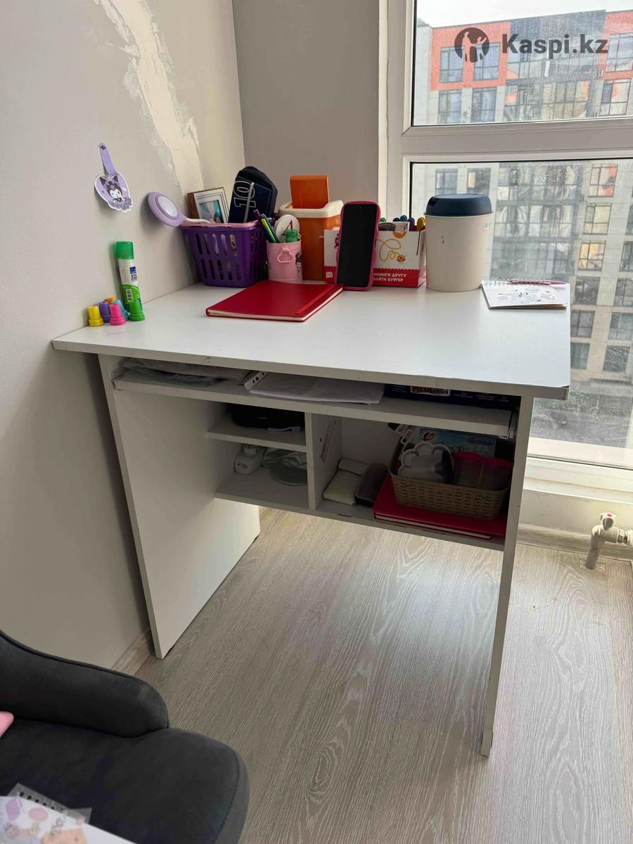 Продаю белый компьютерный стол, в хорошем состоянии. Есть небольшие пятнышки от ручек, следы использования детьми. Стол функциональный, удобный для работы или учебы. Цена — 10 000 тг