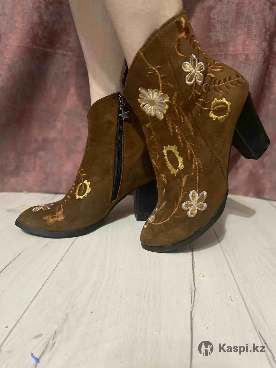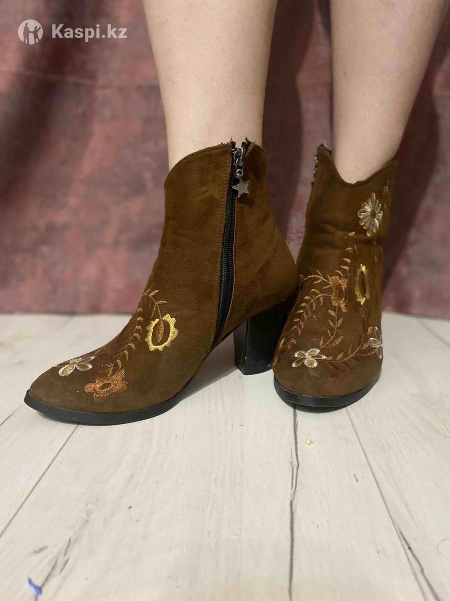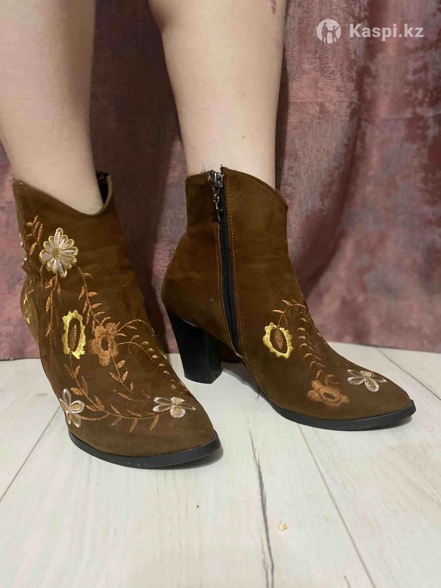 Стильные ботильоны 36 размера. Красивый коричневый цвет с цветочной вышивкой. Удобный устойчивый каблук, аккуратная молния сбоку. Смотрятся очень эффектно с платьями и джинсами. Состояние хорошее. 🏷️ 6000 Писать тут или в , звонки не беру Бостандыкский р (Мкрн Алмагуль)