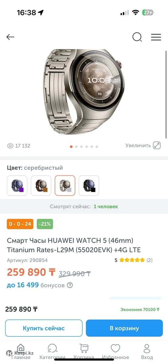 Huawei Watch 5 Titanium — титановый корпус, премиум версия Продаю оригинальные Huawei Watch 5 в титановом корпусе. Премиальная версия часов, лёгкие, прочные и выглядят дорого. Отличное состояние, полностью исправны. Основные характеристики: • Корпус из титана — прочный и лёгкий • Сапфировое стекло, устойчивое к царапинам • AMOLED-экран высокого разрешения, очень яркий и чёткий • Мониторинг здоровья: пульс, кислород в крови (SpO2), ЭКГ, сон, стресс • Более 100 спортивных режимов • Встроенный GPS • Поддержка Bluetooth, Wi-Fi и eSIM (можно звонить с часов) • Водозащита 5 ATM • Автономность до нескольких дней Состояние: Оригинал, всё работает идеально. Без технических проблем. Цена: 65 000 тг (торг возможен) Зарядка есть, коробки сейчас нету. В другом городе Новые покупали около 340 000.