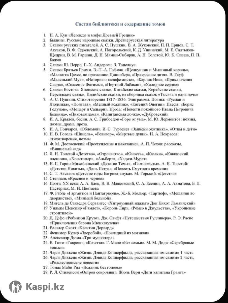 Цена: 1,3 млн. тг. Кожа. Премиум класса. Италия. «Библиотека детской классики» — это замечательный подарок для детей и их родителей, которые получают полноценную, грамотно составленную коллекцию книг, прочтение которых закладывает базу интеллектуального развития ребенка. Тщательно продуманная подборка произведений избавляет от необходимости самостоятельно собирать для ребенка важные и интересные книги. Собрание лучших произведений отечественной и зарубежной детской литературы: программные произведения и тексты, рекомендуемые для внеклассного чтения, шедевры детской классической литературы и сочинения самых популярных авторов. Прекрасное оформление делает это издание ярким украшением любой книжной коллекции и домашней библиотеки. Библиотека лучших детских произведений В издании представлены все жанры прозы, поэзии и драматургии: произведения о детстве и юности, рассказы о животных, приключения, фантастика, детективы, литературные и народные сказки, мифы, легенды и многое другое. Произведения одного или нескольких авторов объединены общей темой и жанром. Каждый том содержат краткую биографическую справку о жизни и творчестве автора и постраничные сноски с объяснением устаревших и непонятных слов. «Библиотека детской классики» — это только классические переводы и лучшие пересказы. Захватывающее чтение для любого возраста В 50 томах собраны книги для детей с 7 лет и до окончания школы, а многие произведения родители смогут читать дошкольникам или с удовольствием перечитывать самостоятельно. В каждом томе есть указание на рекомендуемую возрастную группу (младший, средний или старший школьный возраст); соблюдены все санитарно-гигиенические требования, предъявляемые к изданиям для детей. Великолепное оформление, иллюстрации и книжная графика Роскошный переплетный материал премиум качества (7 цветов, которые повторяются через каждые 7 из 50 томов) дополнен тремя видами тиснения: золотой и цветной фольгой, а также блинтовым тиснением. В издании используются два вида бумаги, высококачественная офсетная для текста, и мелованна – для иллюстраций. Художественные тексты сопровождают замечательные иллюстрации, созданные специально для этого проекта, а также произведения книжной графики для детей, давно ставшие классикой. Каждый том содержит от 12 до 24 цветных иллюстраций или черно-белые гравюры. Технические характеристики Иллюстрации: цветные и черно-белые, 12–24 цветных иллюстрации в каждом томе. Переплет, экокожа с тиснением золотой и цветной фольгой, блинт. Упаковка: 1 комплект в 5 коробках (по 10 томов в каждой), на каждой коробке специальная маркировка.