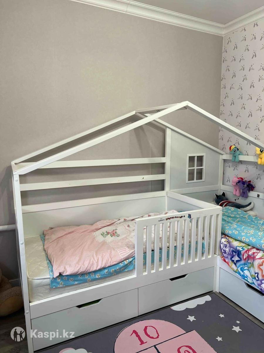 Продается детская кроватка-домик Размер: 160 × 80 см — идеально подойдет для двоих деток. ✅ Стильный дизайн в виде домика — украсит детскую и станет любимым местом для игр и сна ✅ Подходит для детей от года и старше так как есть бортики ✅ имеются три просторных выдвижных шкафчика на колесах для одежды или игрушек. ✅ Изготовлена из прочных материалов, устойчивая и безопасная ✅ Цвет: белый ✅ Состояние: отличное. 📦 В комплект входит: 2 матраса 160 на 80 Цена: 150 000 тг Самовывоз: юго восток , улица 📲 Пишите/звоните, отвечу на все вопросы!