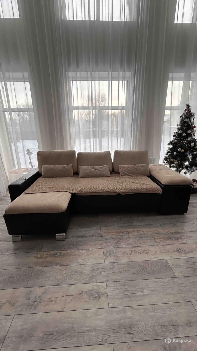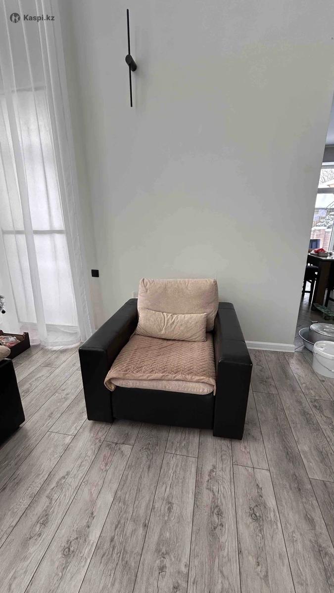 Диван и кресло в отличном состоянии, цвет бежевый комбинирован с кожей темный шоколад, чехлы съемные. Материал бархат. Диван раскладывается, механизм работает отлично. Покупали в 2020 году. Цена 75000 тг торг реальному покупателю. Тел