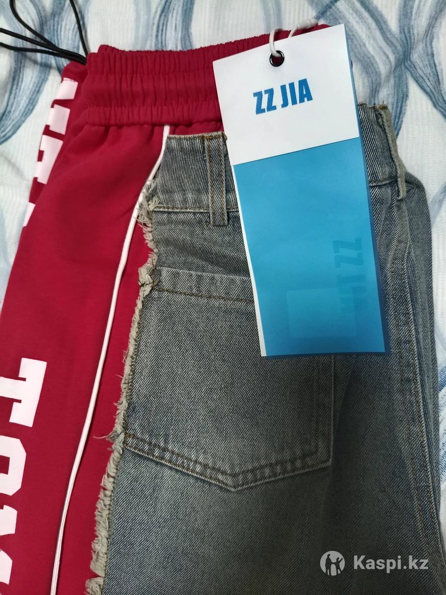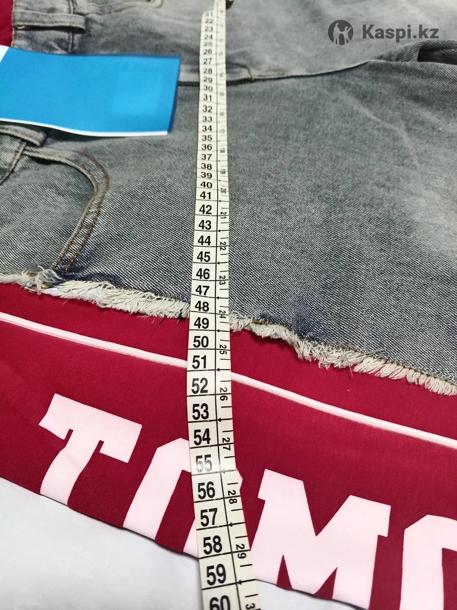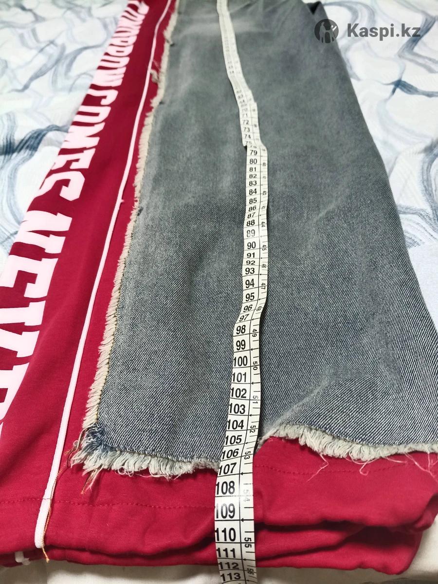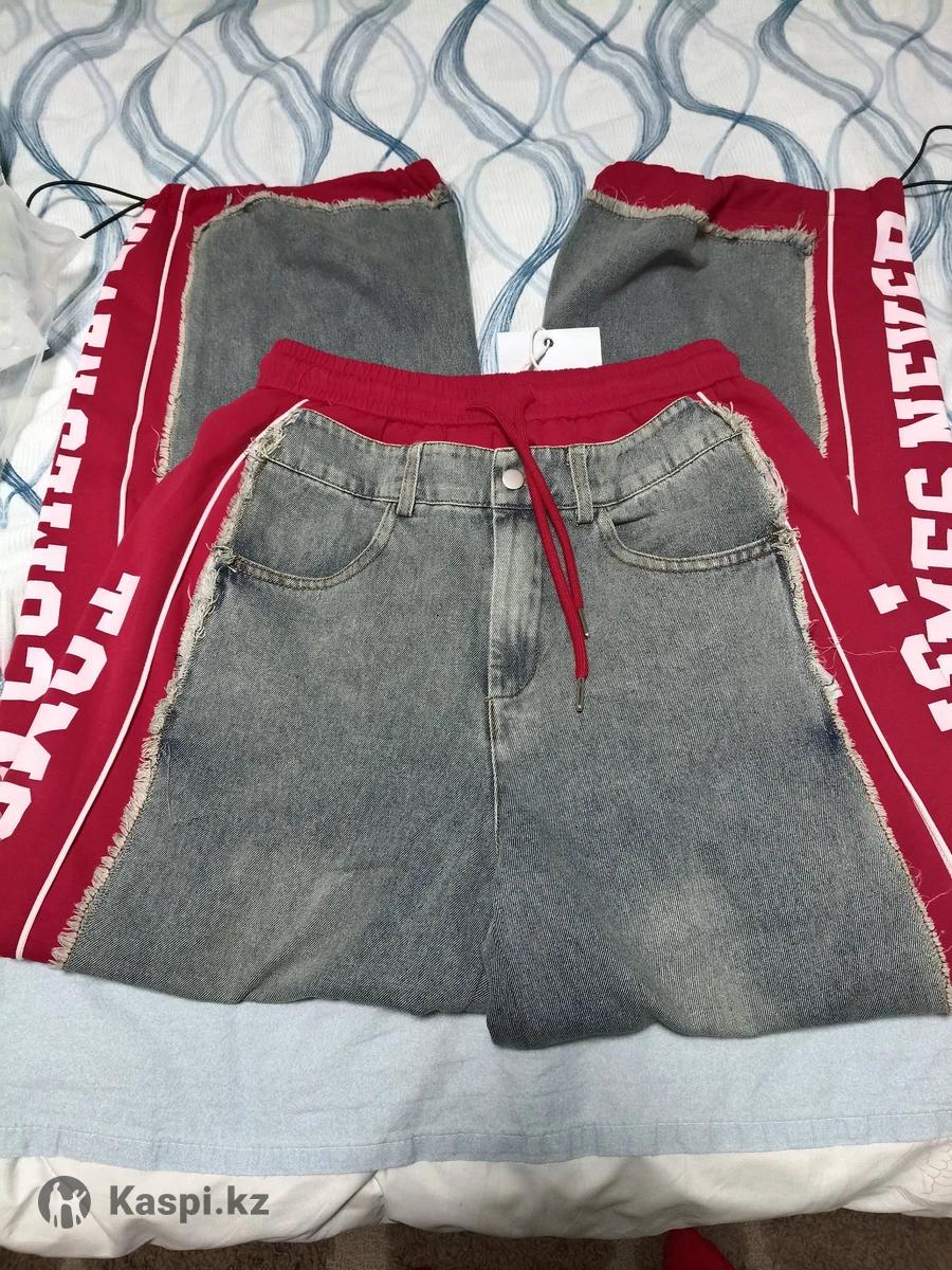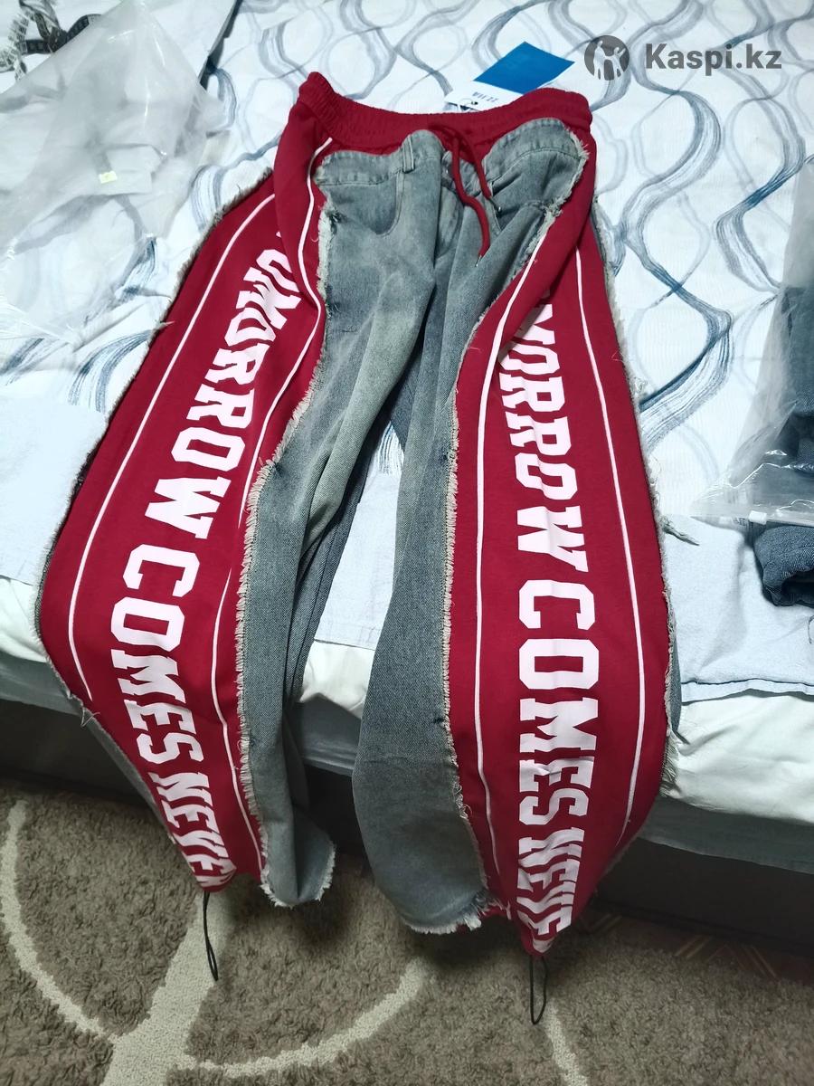 Джинсовые женские брюки с красными вставками с надписью. Купила себе и они мне оказались сильно большие. Длина брюк 110 см. О. Б. 116см.Размер от 50-54