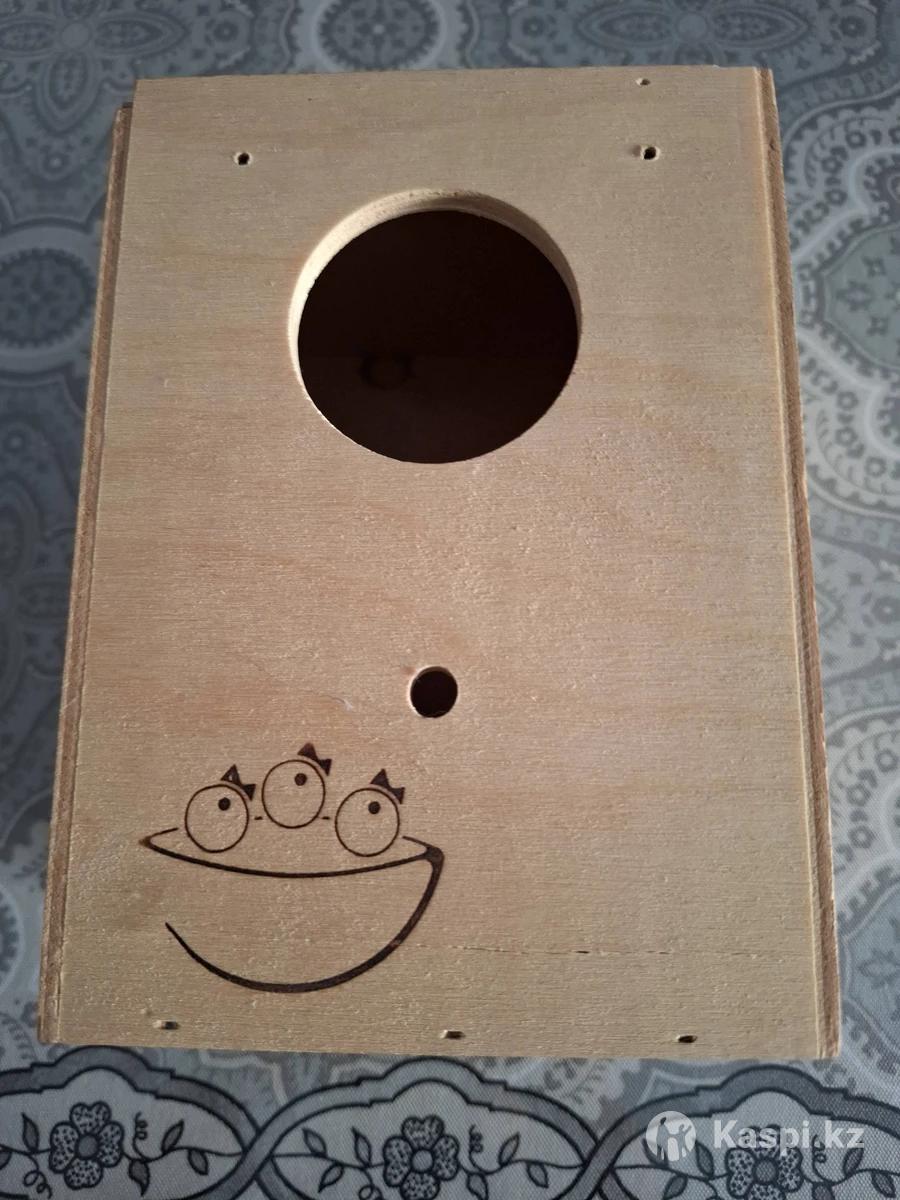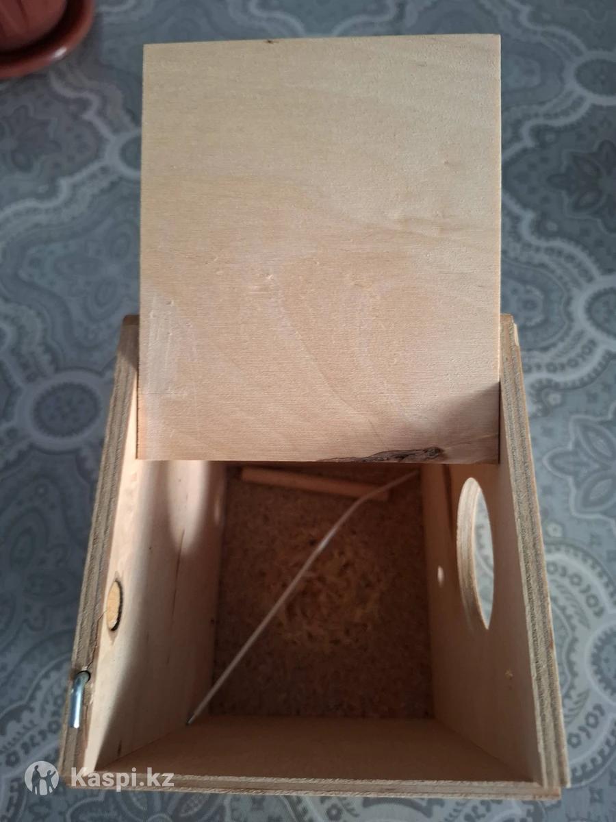 Домик-гнездо из дерева, готовый к установке внутри или снаружи клетки. Новый, не использована, в отличном состоянии находится.