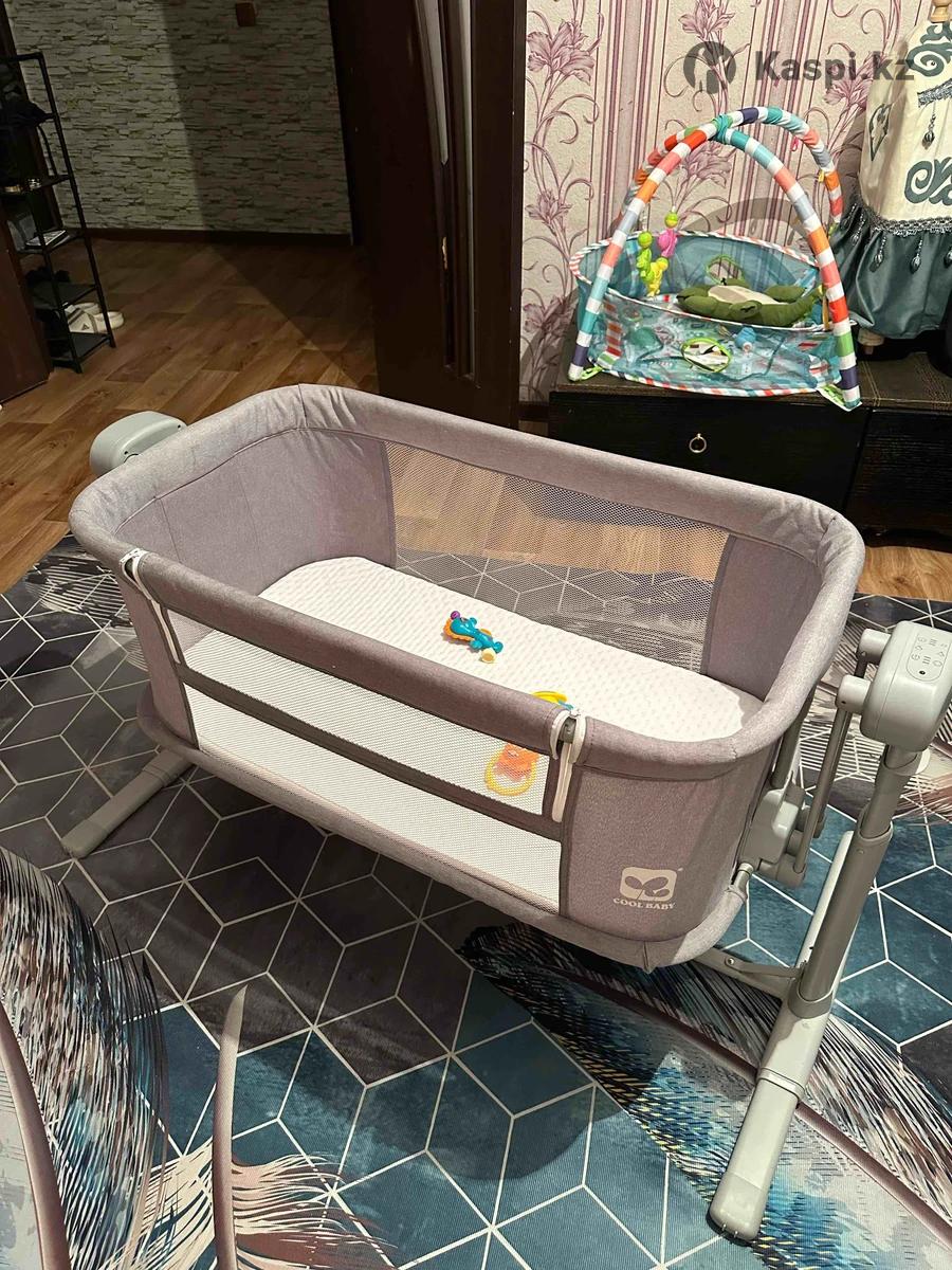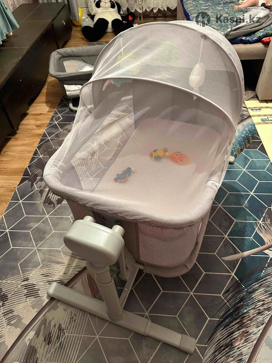 Детская электроманежка с матрасом,в хорошем состоянии,долго не пользовались так как малыш не лежал на ней.Может раскачиваться автоматический в нескольких режимах.Удобно приставать к другой кровати.Возможен уступка
