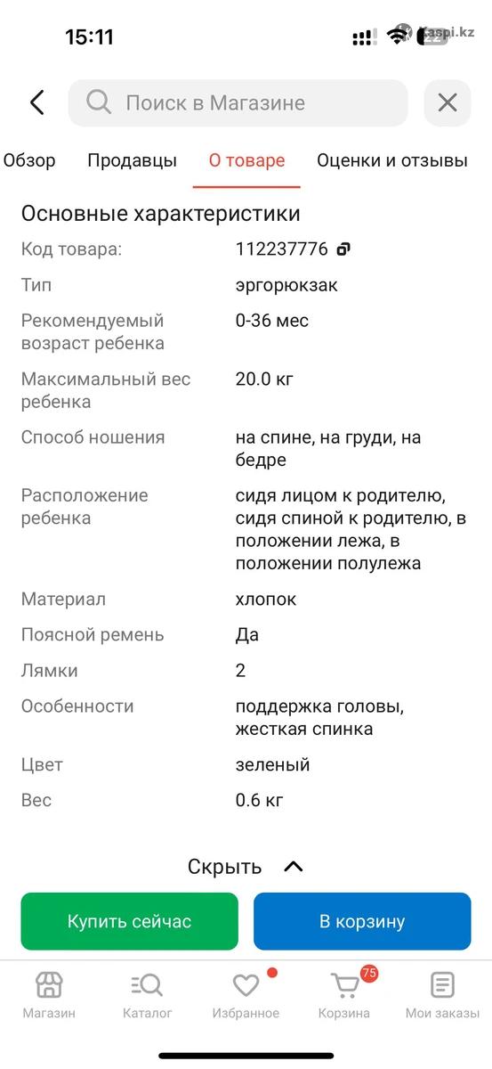 Добрый день. Продам Эргорюкзак Kazimport до 20 кг зеленый. Брали в каспи магазине, носили бережно.
