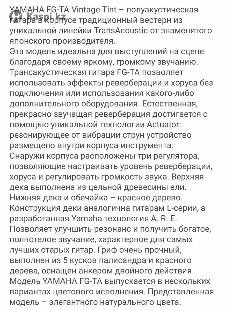 Гитара YAMAHA TransAcoustic FG-TA Vintage Tint YAMAHA FG-TA Vintage Tint - полуакустическая гитара в корпусе традиционный вестерн из уникальной линейки TransAcoustic от знаменитого японского производителя. Эта модель идеальна для выступлений на сцене благодаря своему яркому, громкому звучанию. Трансакустическая гитара FG-TA позволяет использовать эффекты реверберации и хоруса без подключения или использования какого-либо дополнительного оборудования. Естественная, прекрасно звучащая реверберация достигается с помощью уникальной технологии Actuator: резонирующее от вибрации струн устройство размещено внутри корпуса инструмента. Снаружи корпуса расположены три регулятора, позволяющие настраивать уровень реверберации, хоруса и регулировать громкость звука. Верхняя дека выполнена из цельной древесины ели. Нижняя дека и обечайка - красное дерево. Конструкция деки аналогична гитарам L-серии, а разработанная Yamaha технология A. R. E. Позволяет улучшить резонанс и получить богатое, полнотелое звучание, характерное для самых лучших старых гитар. Гриф очень прочный, выполнен из 5 кусков палисандра и красного дерева, оснащен анкером двойного действия. Модель YAMAHA FG-TA выпускается в нескольких вариантах цветового исполнения. Представленная модель - элегантного натурального цвета.Продам цена 300000 т торг продаю в связи с тем что привык к классической гитаре а эту подарили хороший дорогой чехол в подарок