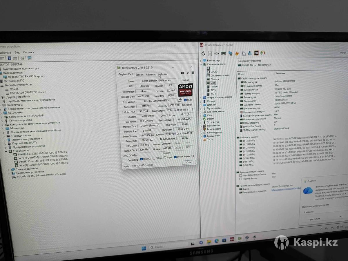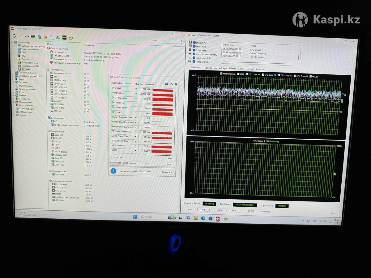 Отличный вариант для Full HD-гейминга, учебы и повседневных задач — все уже собрано, настроено и полностью готово к использованию. Связка Intel Core i3-9100F + RX 480 8GB уверенно тянет популярные онлайн-игры и большинство современных проектов на средних настройках, обеспечивая стабильный и комфортный игровой процесс. Характеристики: • Процессор — Intel Core i3-9100F (4 ядра, до 3.6 ГГц) • Видеокарта — AMD Radeon RX 480 8GB (референсная версия) • Оперативная память — Micron 16 GB DDR4 • Накопитель — SSD 256 GB • Блок питания — Aerocool VX 500 • Охлаждение процессора — Golden Field - башенный кулер, 2 теплотрубки, подсветка • Корпус. стекло спереди, боковая акриловая панель в пленке • Охлаждение корпуса — 4×120 мм ARGB вентилятора Windows 11 Pro, Office 2021 установлена, все драйверы на месте. Компьютер обслужен, работает стабильно, без перегревов. Подойдет для: CS2, Dota 2, Valorant, GTA V, Fortnite, PUBG, World of Tanks и других игр в Full HD. Возможен небольшой торг за наличный расчет. Самовывоз — район Grand Park.