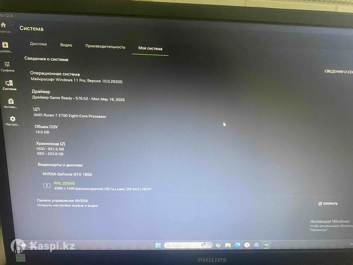 Игровой ПК + комплект + игровой руль Продам готовый компьютер в отличном состоянии — полностью рабочий, все проверено! Подойдет для игр, работы и учебы. Характеристики: • Процессор: AMD Ryzen 7 2700 (8 ядер, 16 потоков) • Видеокарта: NVIDIA GeForce GTX 1650 4GB • ОЗУ: 16 GB • SSD: 223 GB • HDD: 931 GB • Windows 11 Pro (активировать нужно) В комплект входит: • Монитор Philips 22” — 60 Гц, 1440×1080 разрешение • Клавиатура + беспроводная мышь • Самодельный компьютерный стол (удобный ) Компьютер тихо работает, тянет популярные игры (CS2, GTA V, Warzone, Fortnite и т.д.) и любые офисные программы. Бонусом 2 монитор б/у Цена: 198 000 тенге