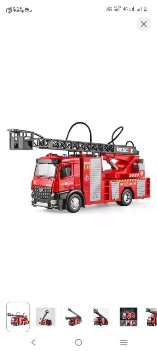 Поворотная платформа, складывающиеся зеркала, инерционная, световые эффекты, звуковые эффекты, открывающиеся двери, вращающиеся колеса, открывающийся отсек Дополнительно Выдвижная лестница с брантспойтом и шлангом подключенным к резервуару с водой, нажимая на механическую кнопку - Брандспойт брызгает водой, металлическая кабина, кузов пластик, двери открываются, отсеки кузова открываются. Звуковой эффект - Нажимая на руль можно посигналить и мигают фары. Размер 27см × 8см × 12см