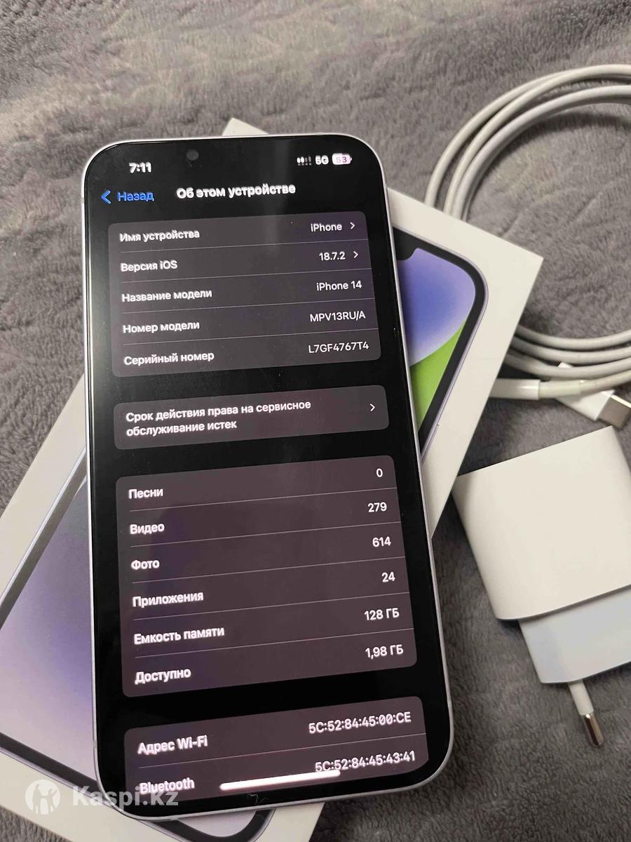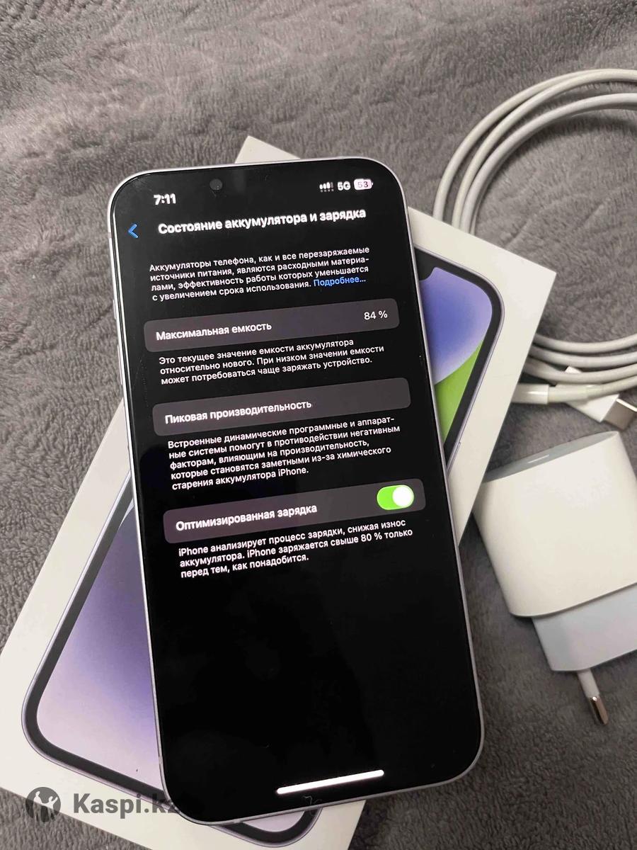 Продам iPhone 14 сиреневый, 128гб Состояние отличное, без царапин и сколов — носился аккуратно, всегда в чехле и со стеклом. Аккумулятор: 84% True Tone работает Все функции исправны, Face ID работает, не вскрывался, не ремонтировался. На момент продажи стоит целое защитное стекло антишпион. В комплекте зарядка оригинал, коробка, ключик для слота. Цена 170.000 тг, возможен торг.