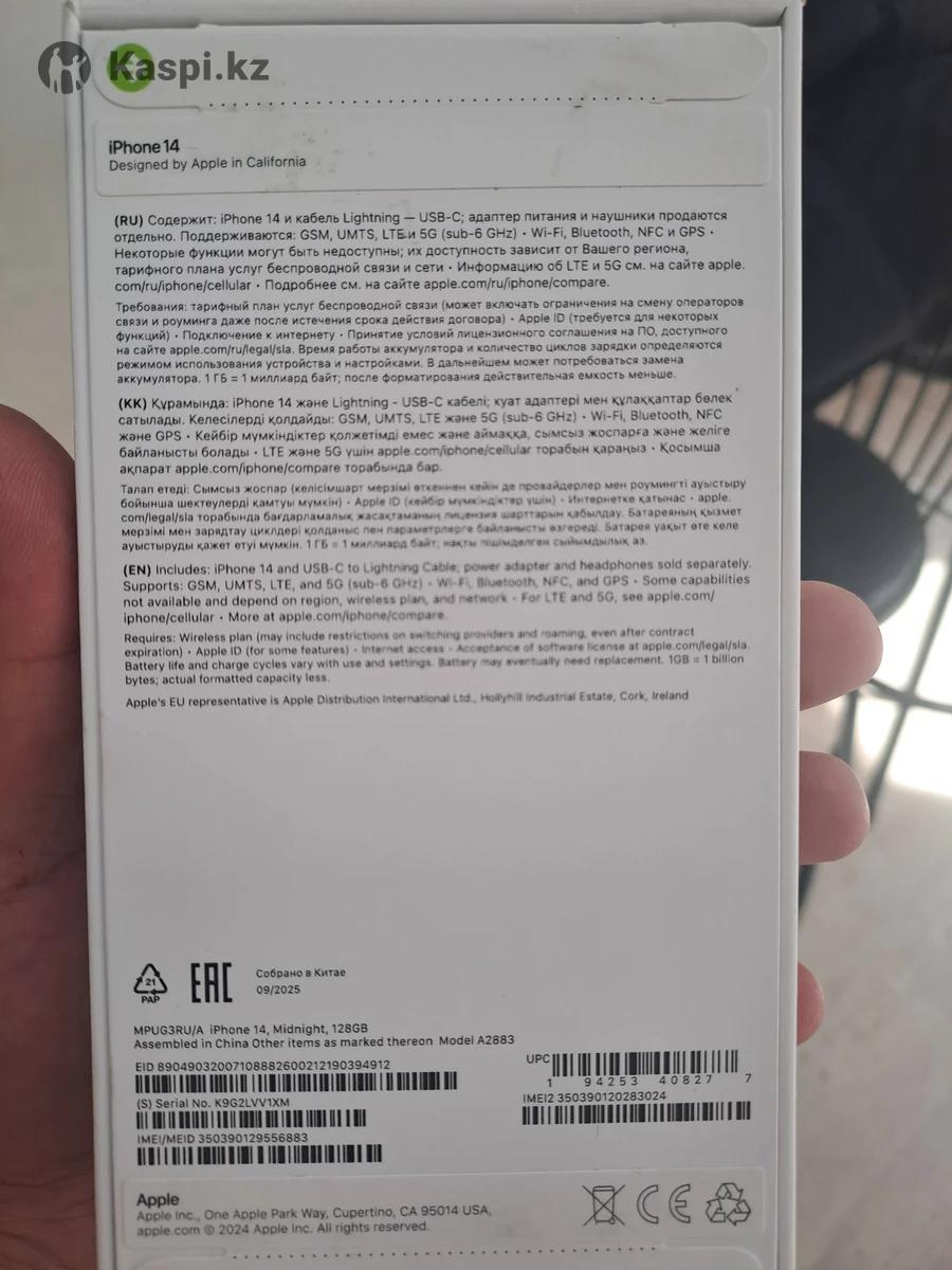 Продам iPhone 14, midnight 128 gb. Новый. Запечатанный. Купил за 380 000 тенге. Срочно нужны деньги