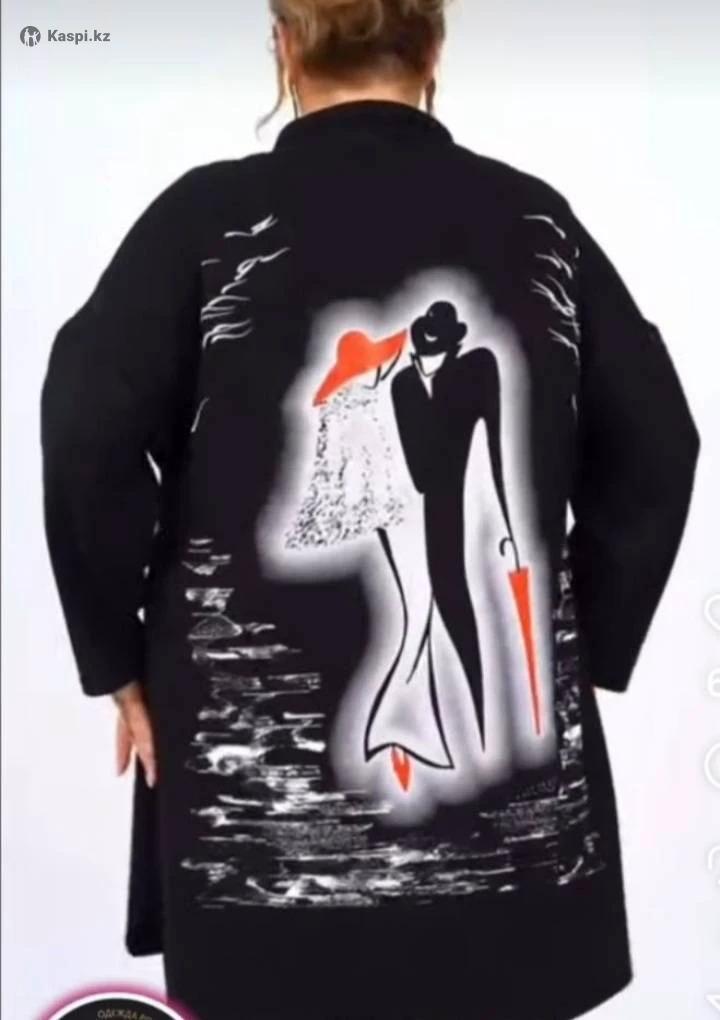 Для женщин с шикарными формами продается стильное платье- кардиган из трикотажа. С красивым принтом на спине. Размер 62. Новое. 20 000 тг.
