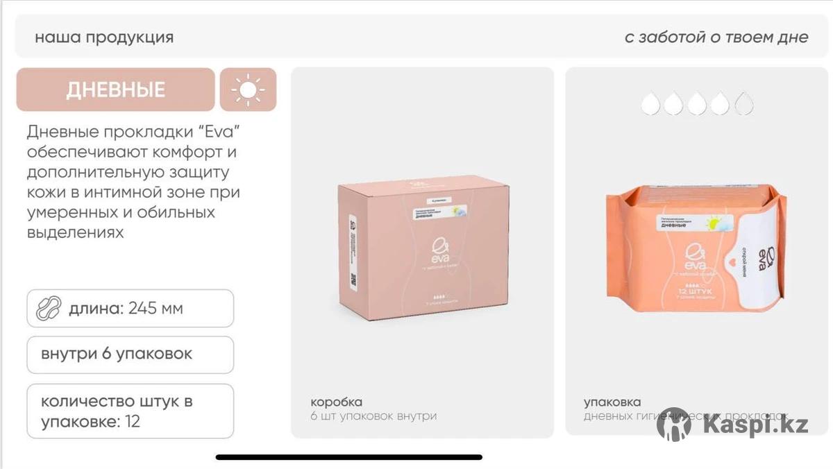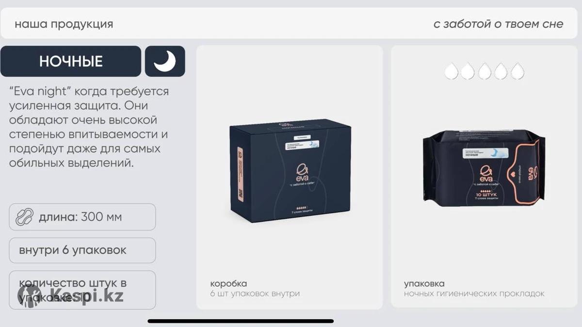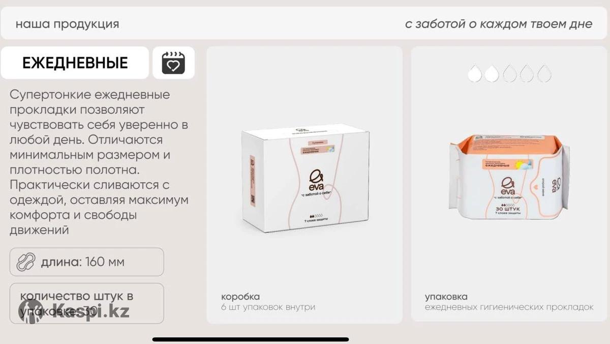 Продам женские прокладки EVA. В наличии ежедневные (в упаковке 30шт) 1200 тенге дневные (в упаковке 12 шт) 1200 тенге ночные ( в упаковке 10шт) 1200 тенге Влажные салфетки (в упаковке 7шт) 125 тенге Бокс дневных прокладок (6 упаковок) 6290 тенге Бокс ночных прокладок (6 упаковок) 6290 тенге Бокс ежедневных прокладок (6упаковок) 6290 тенге Пачка влажных салфеток (8 упаковок) 990 тенге ДОСТАВКА ПРИ ЗАКАЗЕ ОТ 1 бокса по г.Актобе БЕСПЛАТНАЯ
