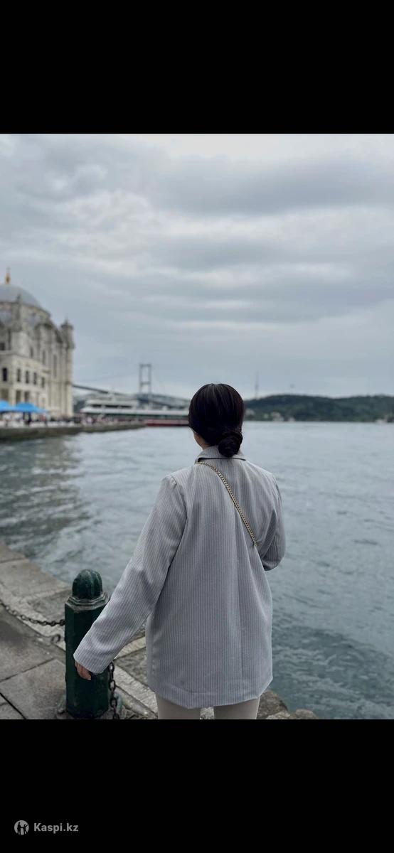 Продам овер сайз пиджак Удлиненная модель и сидит свободно очень Стильно Серый цвет с тоникими белыми полосками Состояние хорошее Удачливый пиджак)) Овер сайз идет на размер с 42 до 50 го размера Очень классный пиджак Покупала в Алмате