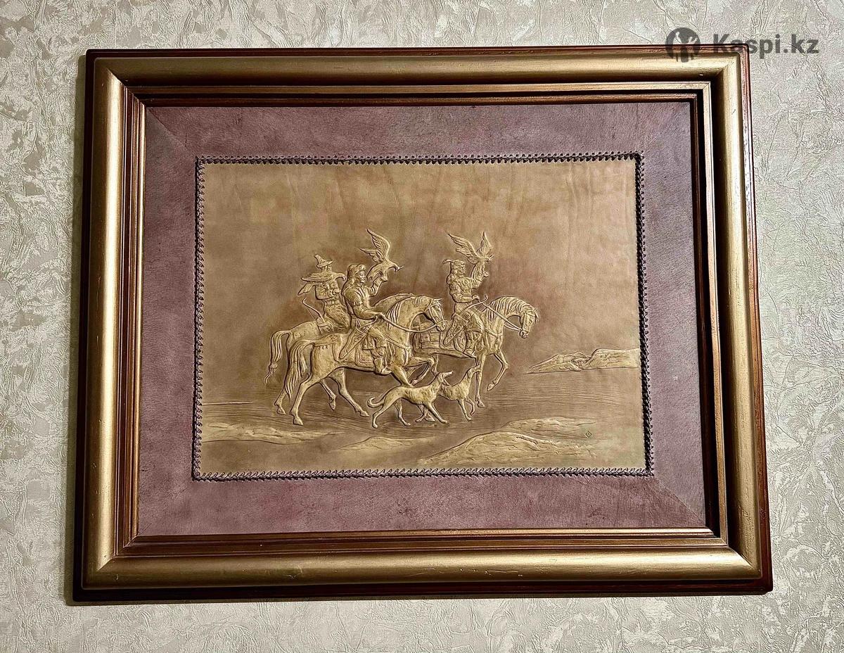 Название: «Охота с беркутами» 📌 Описание: Уникальная декоративная панно в национальном казахском стиле, изображающие охотников на лошадях с беркутами. Рельеф выполнен вручную на прессованной кожи с объемной текстурой и тиснением. Настоящее украшение интерьера, передающее дух традиций и кочевой культуры. 🪵 Материал: кожаное панно 🖼 Размер: 85х70 🖌 Рамка: Деревянная с золотым и бордовым акцентом