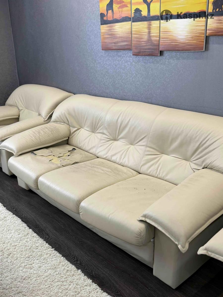 Продам кожаный диван за 10 000 тг, 3-х местный, пострадали подушки и подлокотники, можно обшить, остальное все в хорошем состоянии, 3-х местный. К нему есть кресла в идеальном состоянии по 30 000 тг.