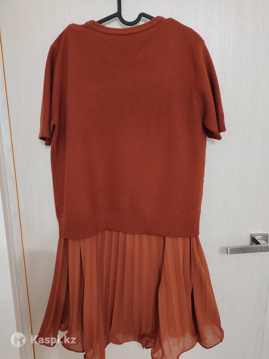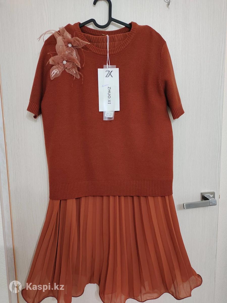 Продам комплект, состоящий из длинной плиссированной шифоновой юбки в пол и кофточки трикотажной, всё можно носить по отдельности. 46 размер, но может подойти на 48 размер. На кофточке сбоку есть брошь съёмная в виде украшения цветка. Цвет терракотовый модный в этом году.