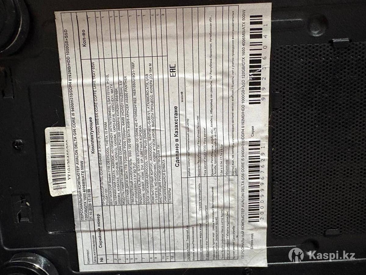 💻💻 Продаю системный блок Avalon Delta G66 Характеристики: 🔹 Процессор: Intel Core i5-9400F (6 ядер / 12 потоков, до 2.9 GHz) 🔹 Оперативная память: 8 GB DDR4 🔹 Накопители: SSD 120 GB + HDD 1000 GB 🔹 Видеокарта: NVIDIA GeForce GTX 1650, 6 GB 🔹 Материнская плата: ASUS H410M 🔹 Блок питания: ATX 500W 🔹 Корпус: Avalon Delta G66 с хорошей вентиляцией Состояние: отличное, использовался бережно. Подходит для игр, работы и учебы. Тянет современные игры на высоких настройках, быстро справляется с офисными и графическими задачами. 📦 В комплекте: системный блок. Сделано в Казахстане. Цена: . 📍 Доставка