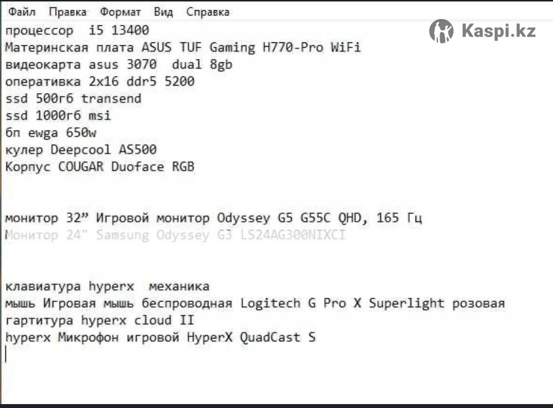 процессор i5 13400 Материнская плата ASUS TUF Gaming H770-Pro WiFi видеокарта asus 3070 dual 8gb оперативка 2х16 ddr5 5200 ssd 500гб transend ssd 1000гб msi бп ewga 650w кулер Deepcool AS500 Корпус COUGAR Duoface RGB монитор 32” Игровой монитор Odyssey G5 G55C QHD, 165 Гц клавиатура hyperx механика мышь Игровая мышь беспроводная Logitech G Pro X Superlight розовая гарнитура hyperx cloud II hyperx Микрофон игровой HyperX QuadCast