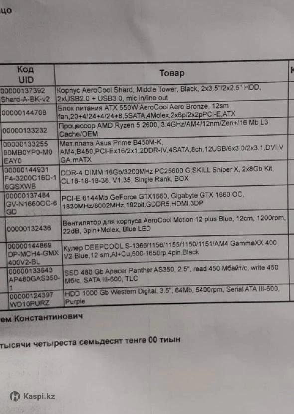 Компьютер полностью обслужен,, все исправно, тянет все игры с хорошим FPS, все рабочие приложения с быстрым рендером, был собран в 2021 году на заказ в магазине Белый Ветер, за срок службы не разу не подвел, ничего не менялось, все характеристики видны на фото Процессор: RYZEN 5 2600 OEM Мат.плата: ASUS PRIME B450M-K ОЗУ: Gskill sniper X 8x2 (16gb) DDR4 3200mhz Видеокарта: Gigabyte GTX 1660 OC 6GB Башня куллер: deepcool 400v2 Память: apacer panhter SSD 480gb + 1000HDD western Блок питания: 550W Aerocool Aero bronze Корпус: aerocool shard Процессор и видеокарта заточены под разгон, чем я не занимался, можно усилить мощь при желании Покупал за 400тыс.тг Продаю в связи с покупкой ноутбука для учебы В наборе так же идет: - Монитор 1920х1080 FULL HD 21 дюйм, 60гц - Клавиатура проводная Butcher игровая, мембранная, различные режимы подсветки, RGB - беспроводная бесшумная игровая мышь, с подсветкой, имеются дополнительно кнопка изменения чувствительности, две боковые кнопки под ваши задачи - Микрофон, конденсаторный микрофон, для записи музыки не сойдет но играть самое то - накладные Наушники, с длинным проводом для удобства, так же есть встроенный микрофон - игровой ковер на 400х900х3мм Красивый узор, хорошее качество - Wifi адаптер - Bluetooth адаптер - все кабели для подключения монитора Торг уместен