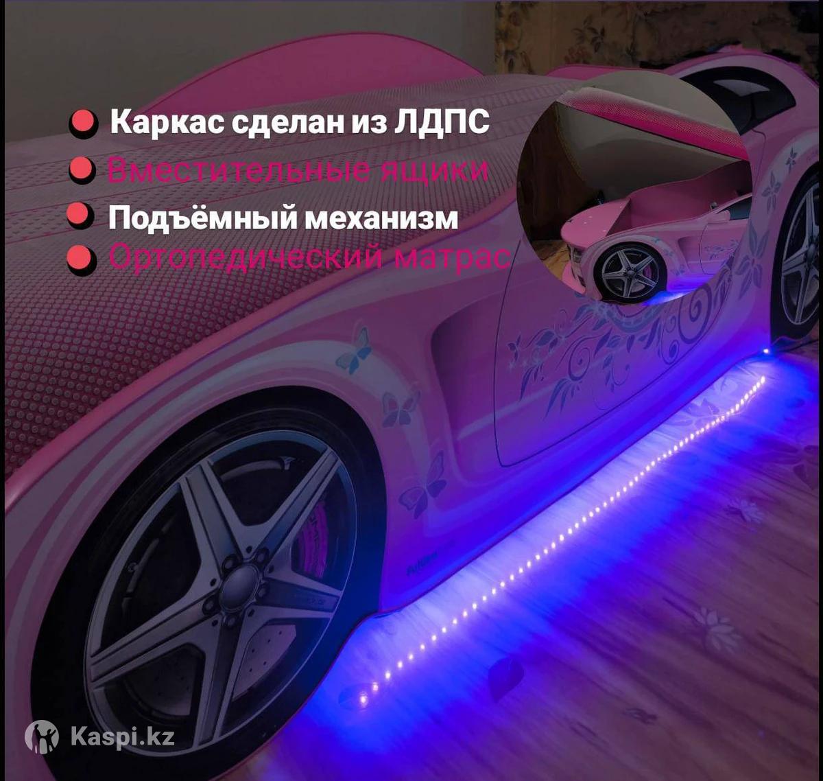 Стильный дизайн. Каркас кровати выполнен из экологичного ЛДСП, соответствует всем стандартам качества и не имеет химического запаха. Все края кровати покрыты кромкой ПВХ 1 мм и безопасны для малышей. Рисунок выполнен безопасными ультрафиолетовыми чернилами, устойчивыми к стиранию. Размер спального места: 75/180 см., с бортиками для предотвращения падения ребенка. Нагрузка 120кг Рекомендуется для детей от 2 до 14 лет. Ортопедический матрас в комплекте, обит плотным, износостойким велюром, приятным на ощупь. Подъемный механизм позволяет легко трансформировать кровать. Стенки кровати сплошные. Ящик под кроватью, подсветка дна, фар. В отличном состоянии! Самовывоз.