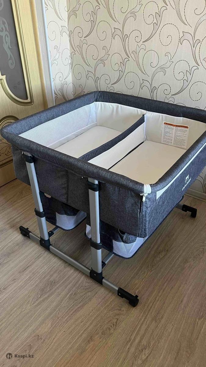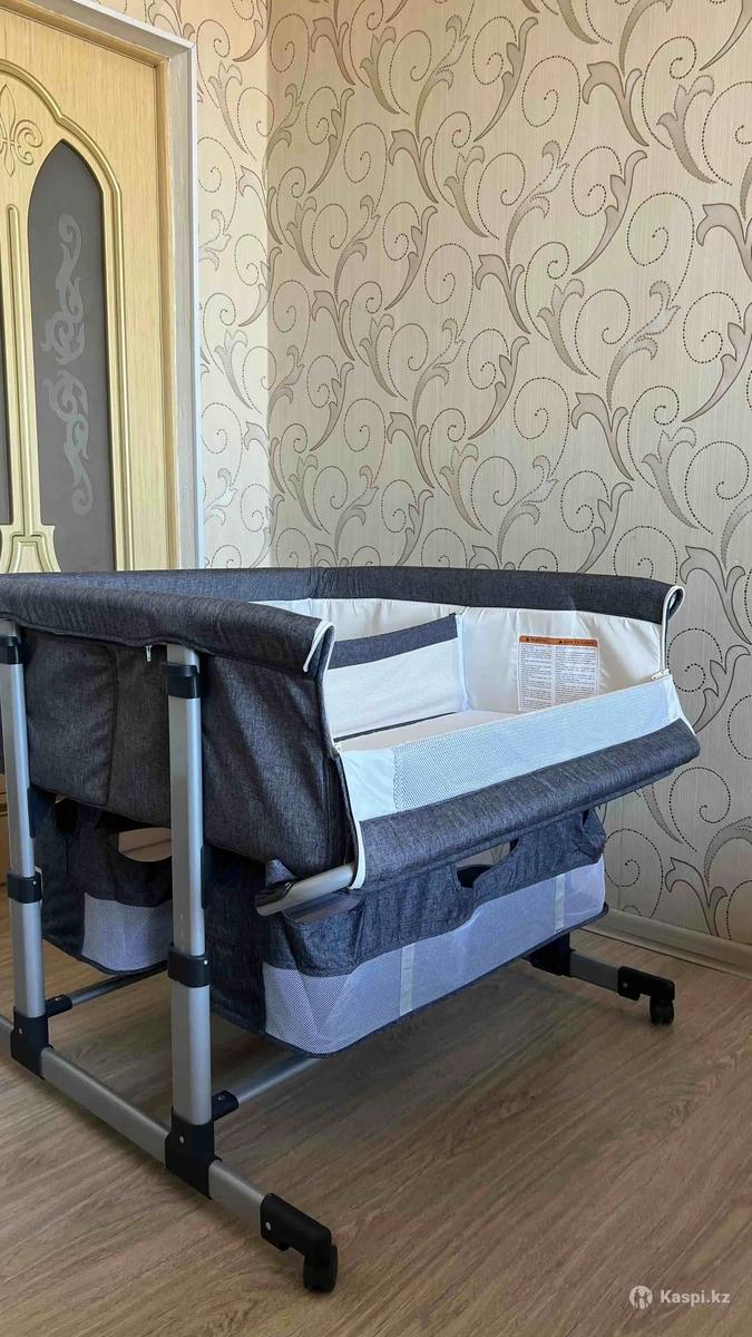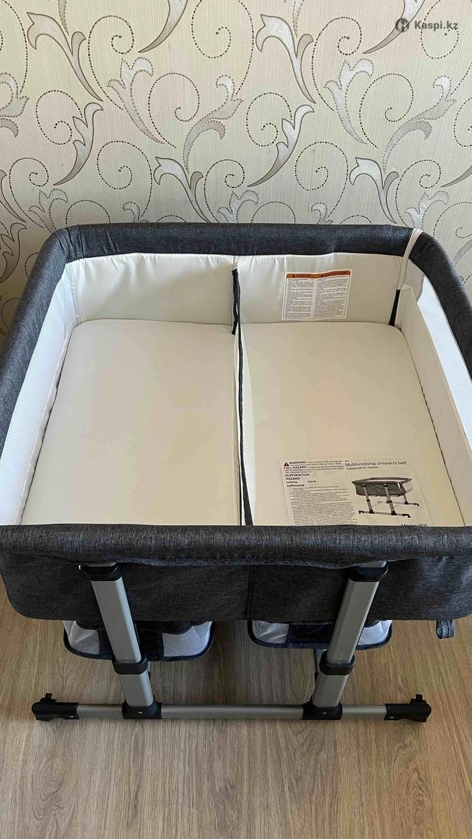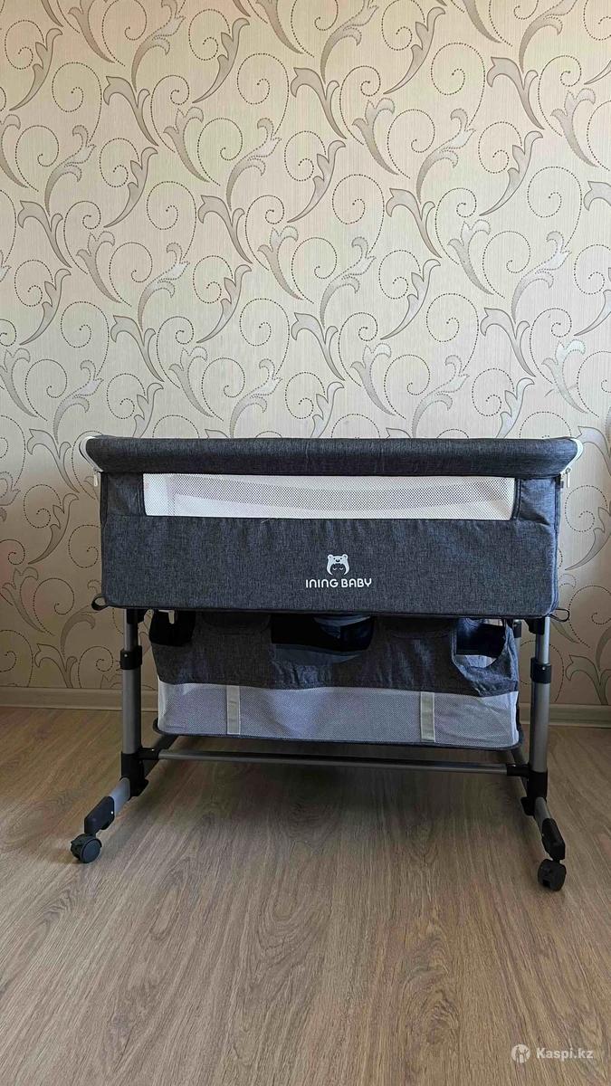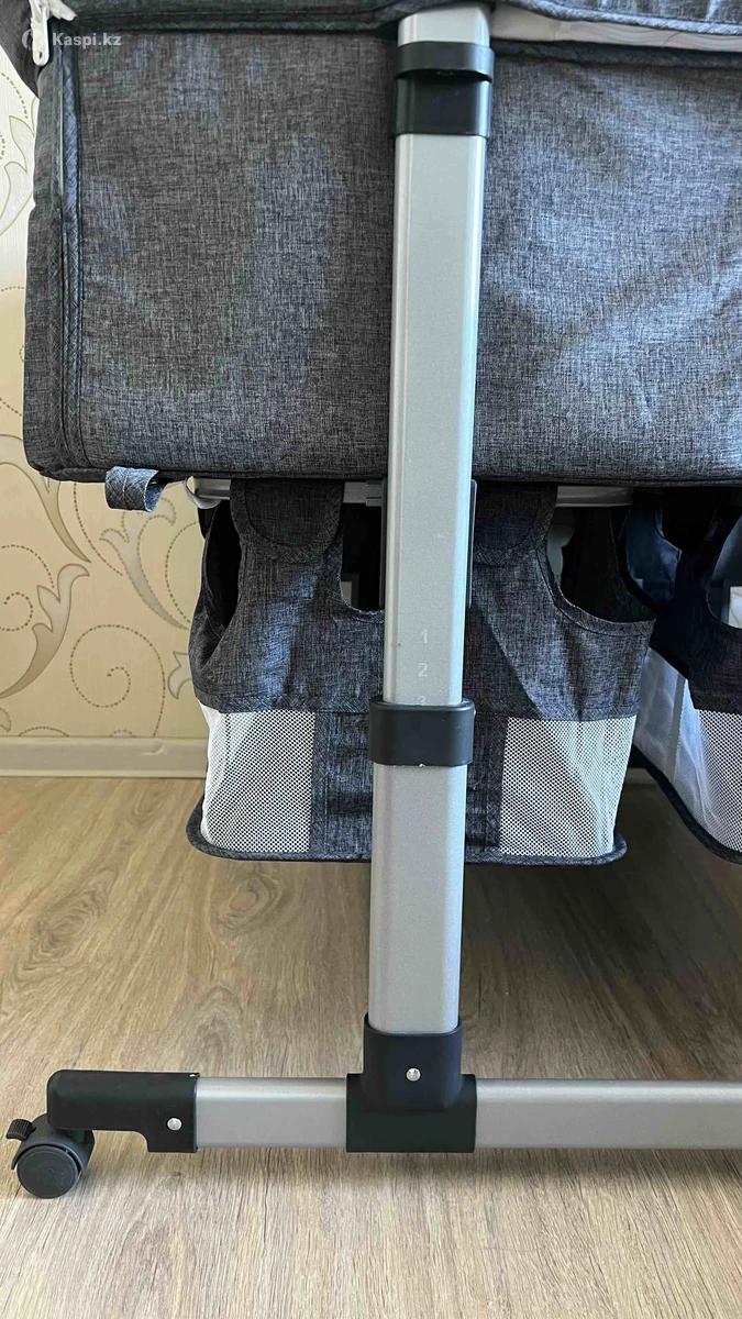 Кроватка в идеальном состоянии. На колесиках, высота регулируется. Можно приставить к кровати-открывается замок с одной стороны. Разделитель кроватки снимается. Внизу дополнительное место, чтобы складывать вещи/игрушки. Удобен в использовании.