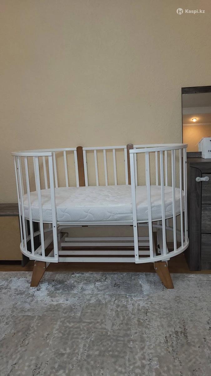 Кроватка-трансформер с первых дней жизни малыша, растет вместе с ребенком, удобная во всех смыслах, есть колёсики, люлька передвигается по дому. Маятник- плавно качает малыша силой одного пальца взрослого человека. Можно установить как прикроватную, сняв одну боковую дверь. Уютная,красивая из качественного дерева, краска не откалывается, кроватка в очень хорошем состоянии, продаю за пол цены,т.к.ребенок вырос. Матрас приобретала отдельно, отдам вместе. По всем вопросам пишите на Местоположение:Каскелен. Возможна доставка