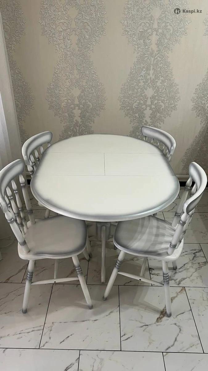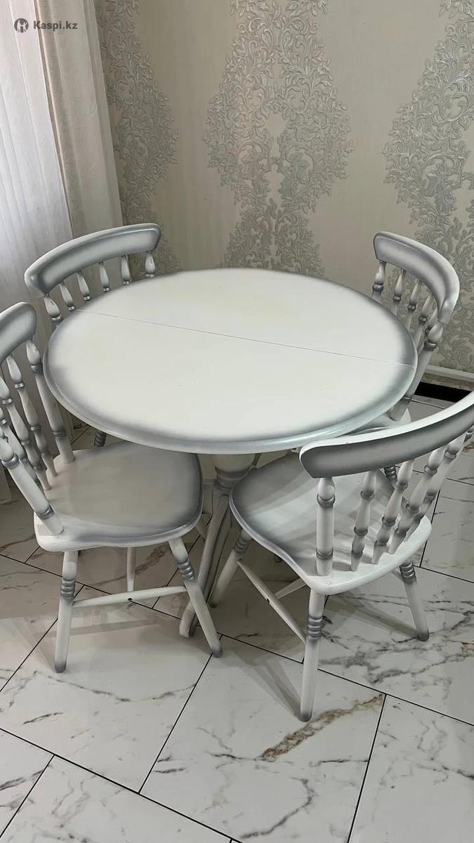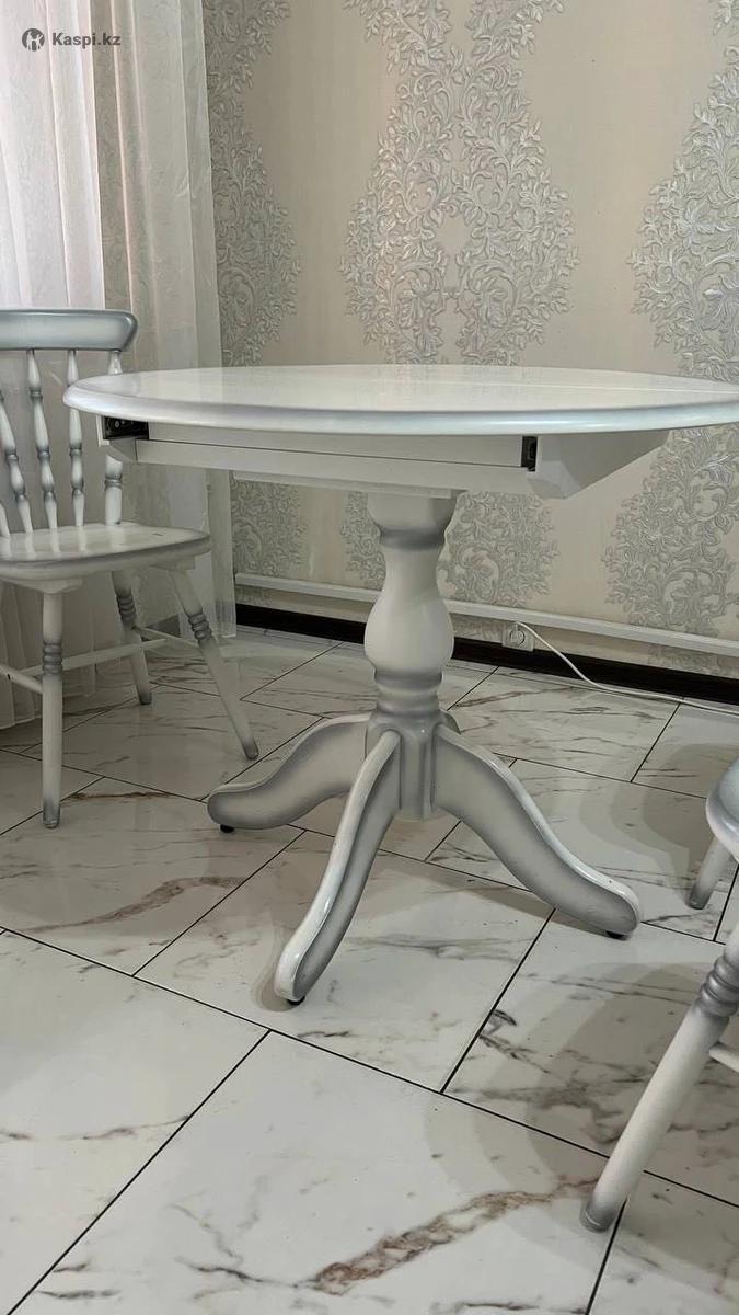 Натуральное дерево. Массив березы. Размеры: диаметра собранном виде 90 см, в разложенном 125 90 см. Производство Экомебель. В хорошем состоянии. В комплект идут 4 стула. Самовывоз! Писать на .