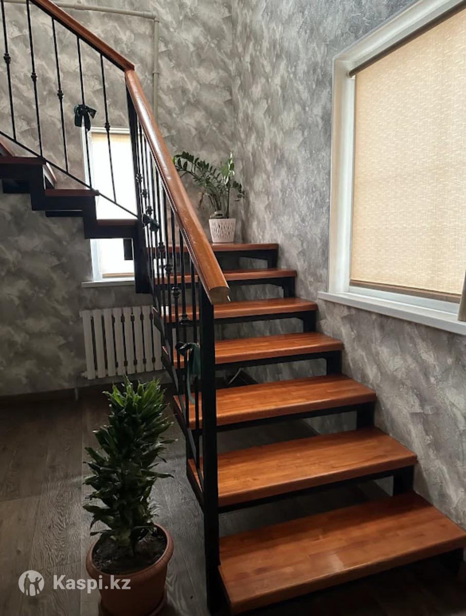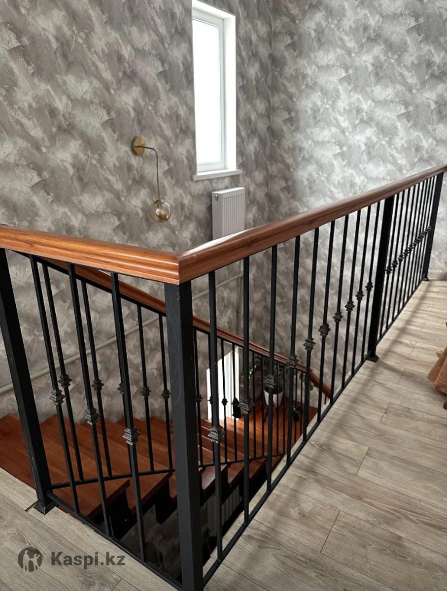 Металлическая каркасная лестница , черная матовая . Ступеньки и перила из сосны .
