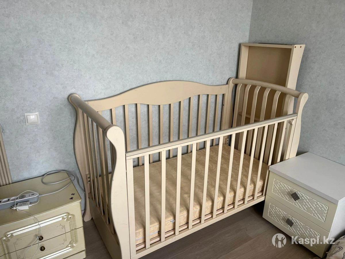 Качественная манеж/кровать 120см с матрасом, ширина 80см. Под манежем раздвижной ящик для хранения, ничего не сломано! Одна сторона манежи отпускается. Можно использовать как кровать так как в длину 120 см. Дерево очень прочное! Если вы в Алматы есть доставка!