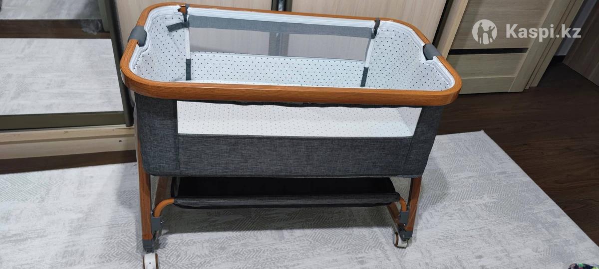 Поперечный маятниковый механизм, опускающаяся, имеется матрас, материал из металла и текстиля, размер 97х57х87 см, также имеется стопор на колесах, москитная сетка, пеленальный столик, регулировка высоты, от 0 до 3 лет. Абсолютно новый манеж, очень легко собирается. Ребенок не захотел там спать. Покупали в конце июля текущего года через каспи за 35 тыс. Торг