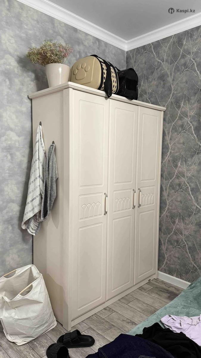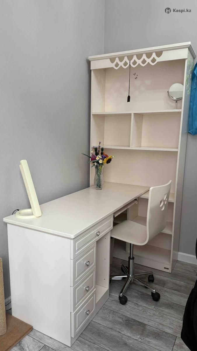 Продам мебель, всю разом. Кровать с матрасом, рабочий стол с прикрепленным боковым шкафом, шкаф, туалетный столик, 2 стула (белый и синий), пуфик. Продам все за 95к тенге, нужно будет забрать самим